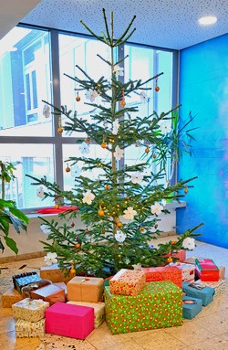 Aktuell: Die gestifteteten Geschenke werden unter dem Christbaum im 1. Stock unserer Schule gesammelt.