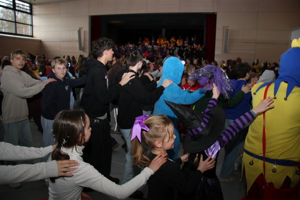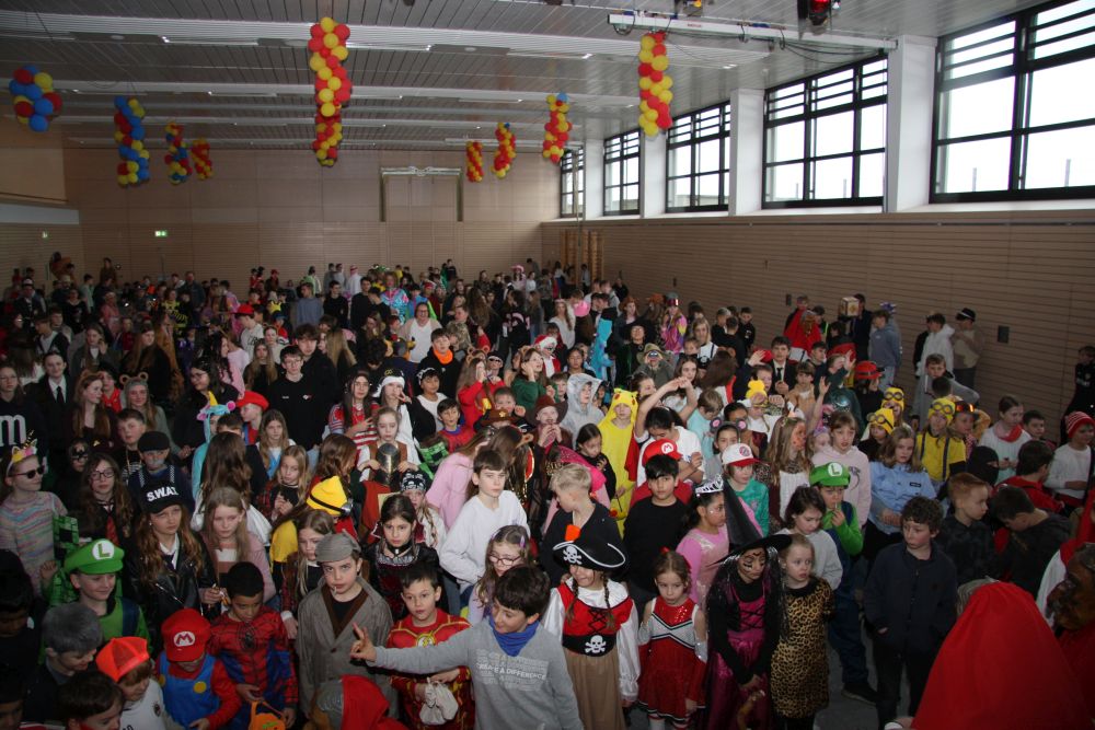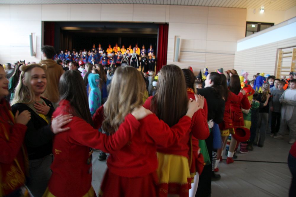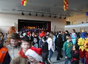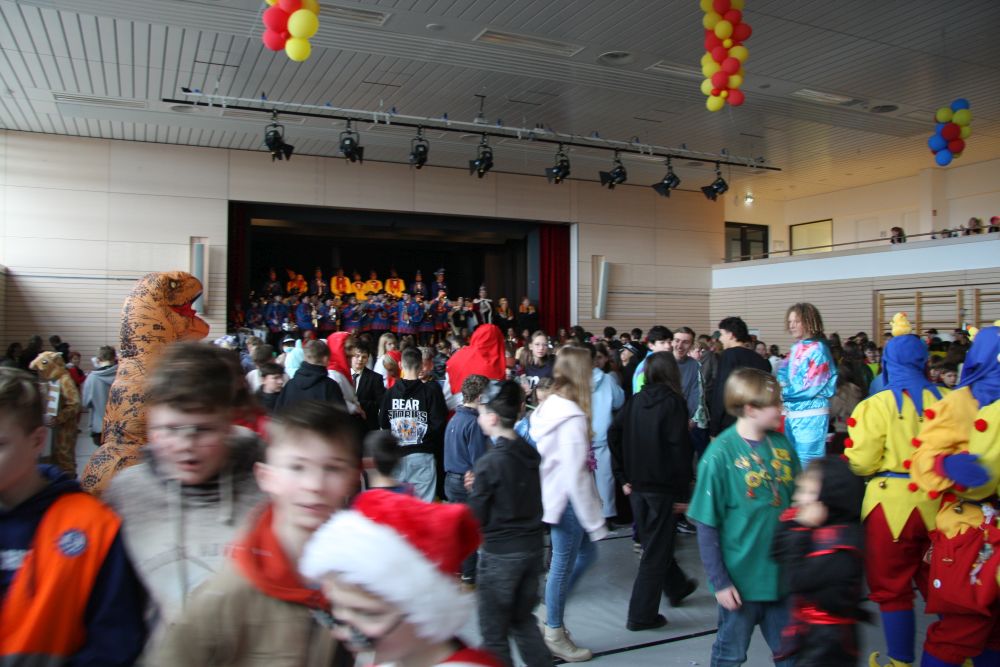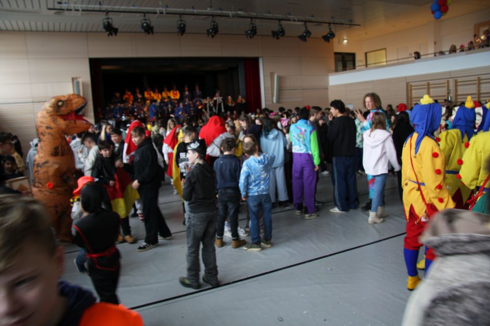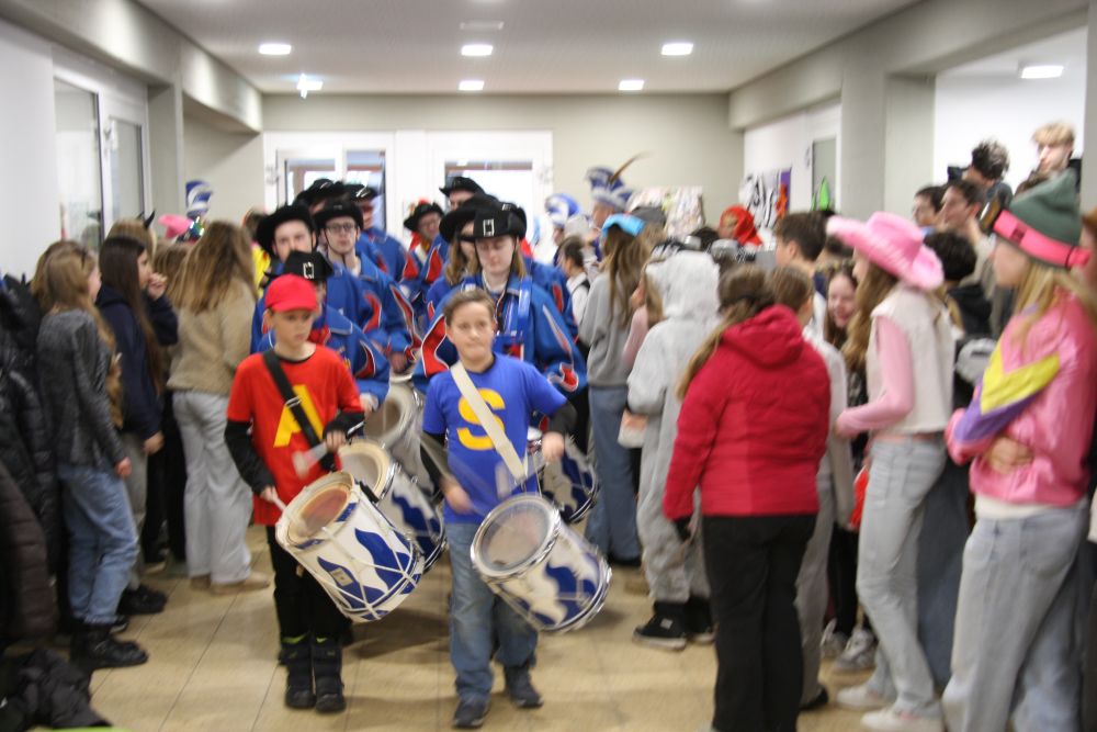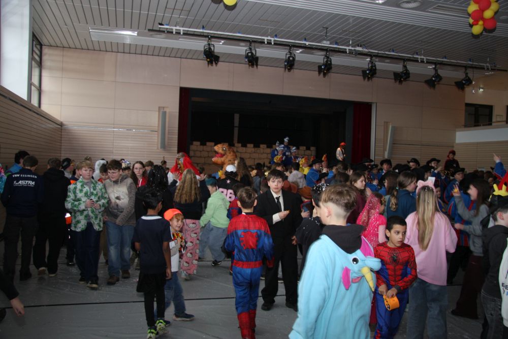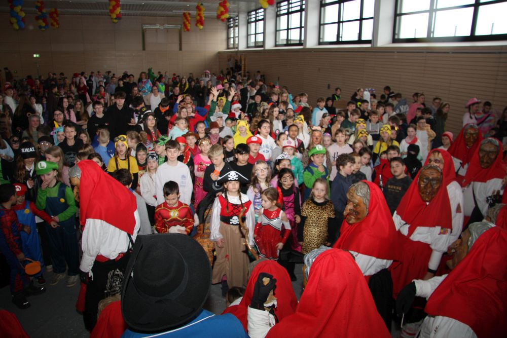 Mit großem Lärm und Dschinderassabumm stürmte die Schar das Schulhaus, durchstreifte sämtliche Stockwerke, Treppenhäuser und Gänge und riss die Schüler aus dem hochkonzentrierten Unterricht. In langem Zug ging es dann hinüber in die Remshalle, wo alles in ein buntes Faschingstreiben mündete, zunächst unter Kommando der Haugga Narra und Holger Franke, und als diese dann weiterzogen, mit unserem wieder genesenen Herrn Schrader, nachdem er im vergangenen Jahr mit lädierter Schulter ausgefallen war, als Stimmungskanone. Die "Zappelkids" und die Kindergarde der Schönbrunnennnarren des TSV Essingen bereichtern das Bühnenprogramm.