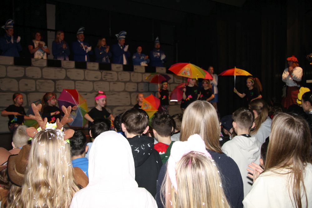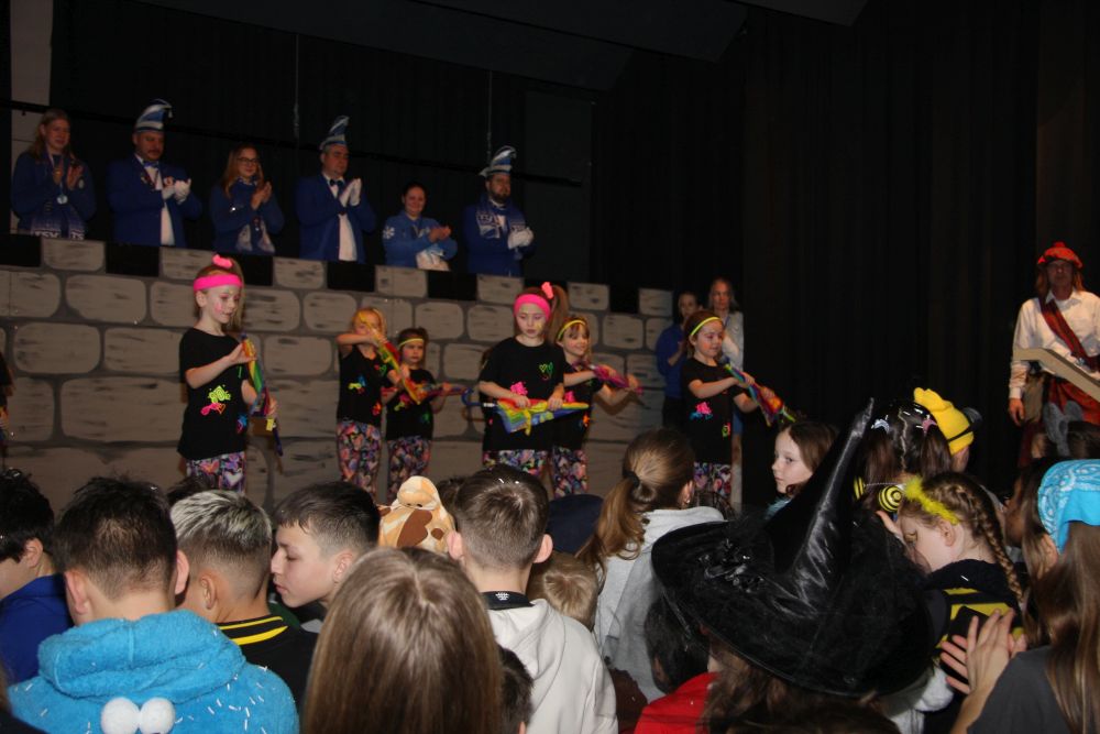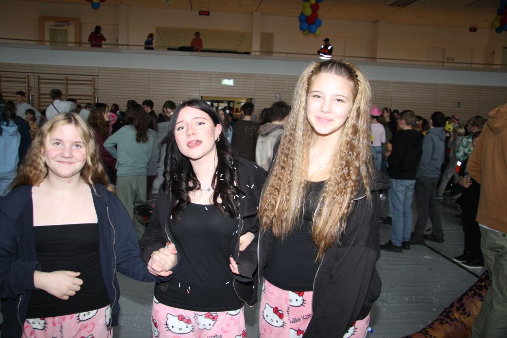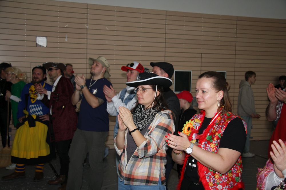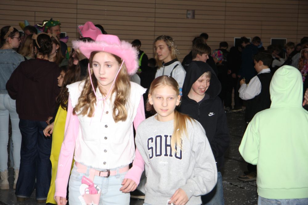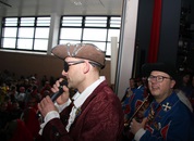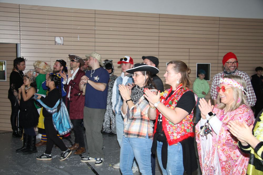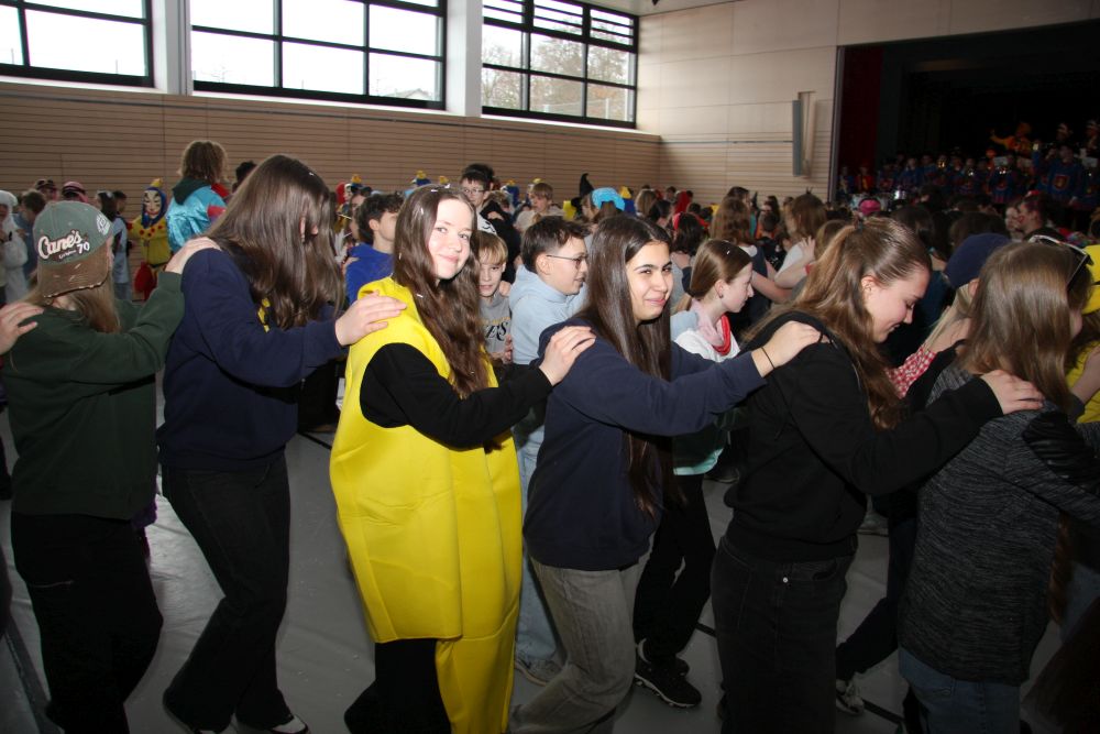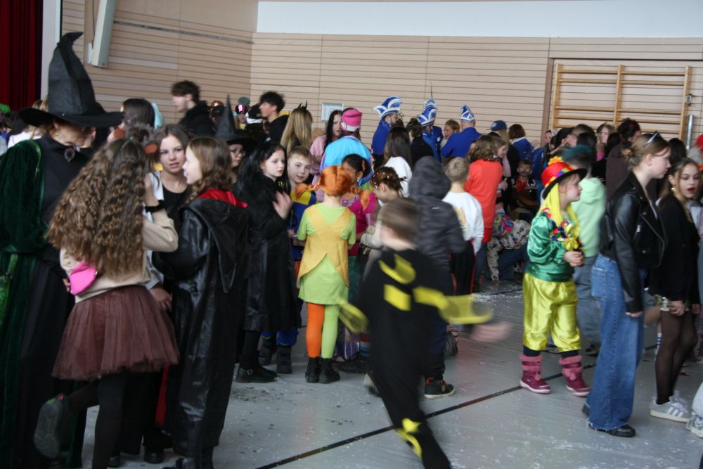 Mit großem Lärm und Dschinderassabumm stürmte die Schar das Schulhaus, durchstreifte sämtliche Stockwerke, Treppenhäuser und Gänge und riss die Schüler aus dem hochkonzentrierten Unterricht. In langem Zug ging es dann hinüber in die Remshalle, wo alles in ein buntes Faschingstreiben mündete, zunächst unter Kommando der Haugga Narra und Holger Franke, und als diese dann weiterzogen, mit unserem wieder genesenen Herrn Schrader, nachdem er im vergangenen Jahr mit lädierter Schulter ausgefallen war, als Stimmungskanone. Die "Zappelkids" und die Kindergarde der Schönbrunnennnarren des TSV Essingen bereichtern das Bühnenprogramm.