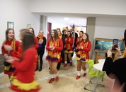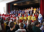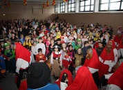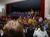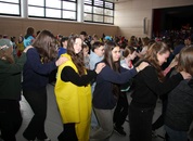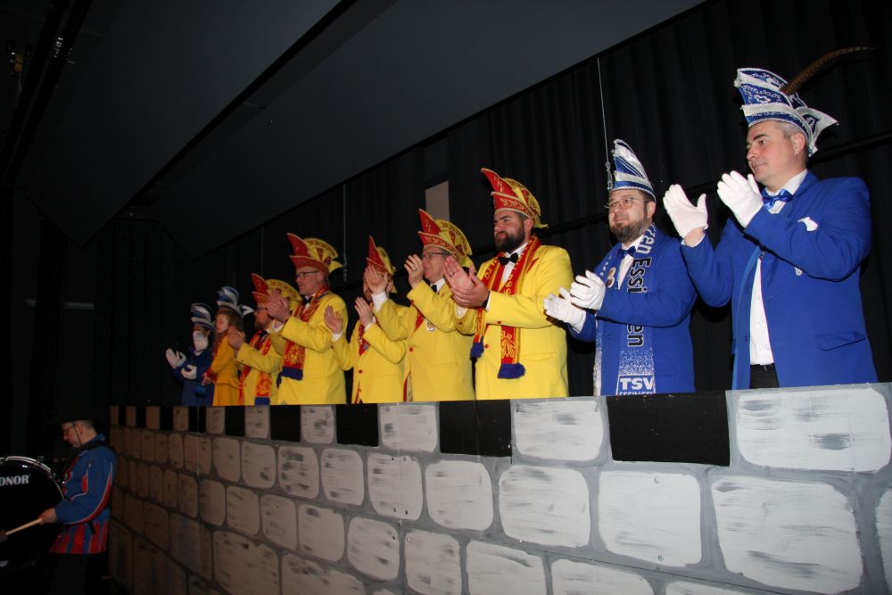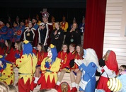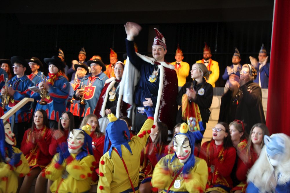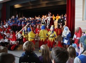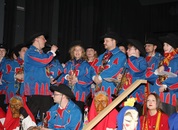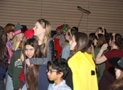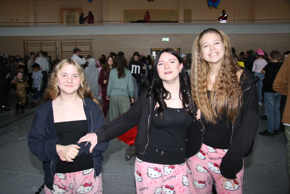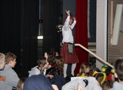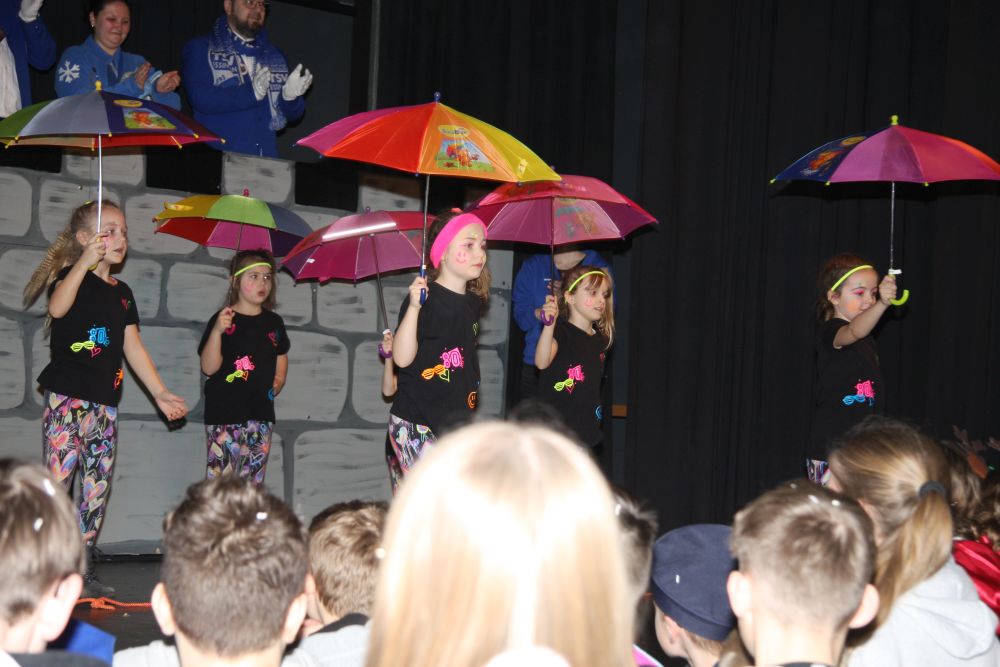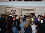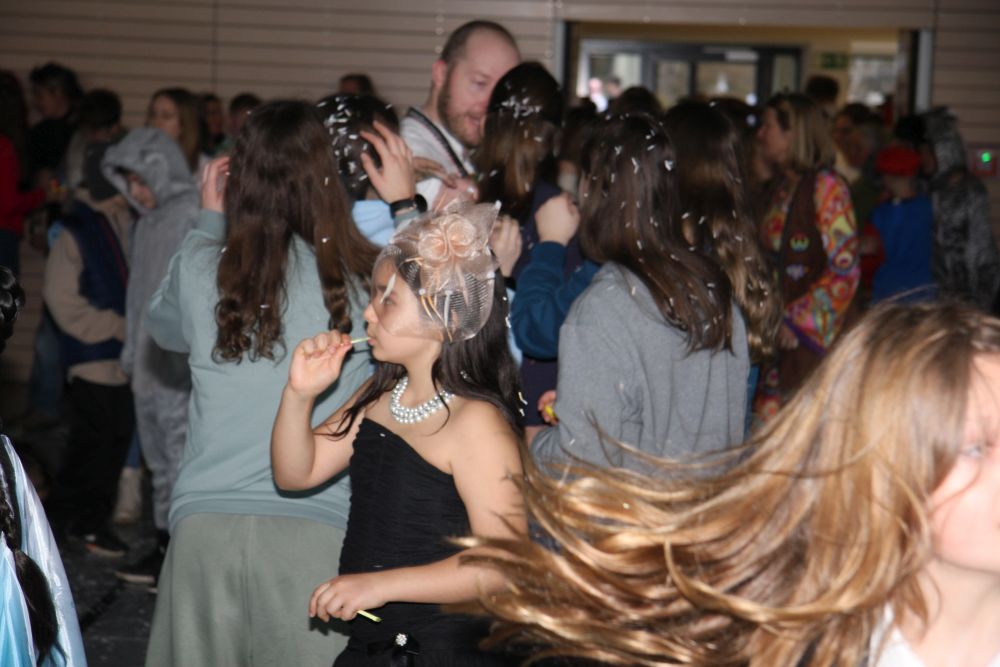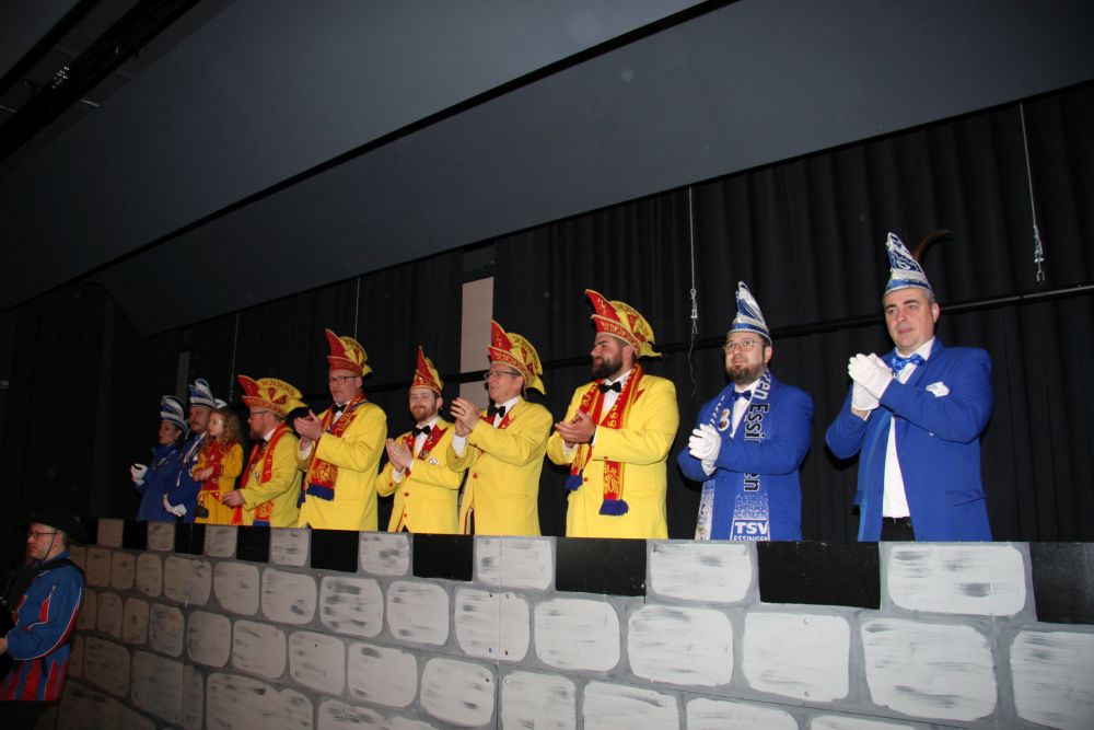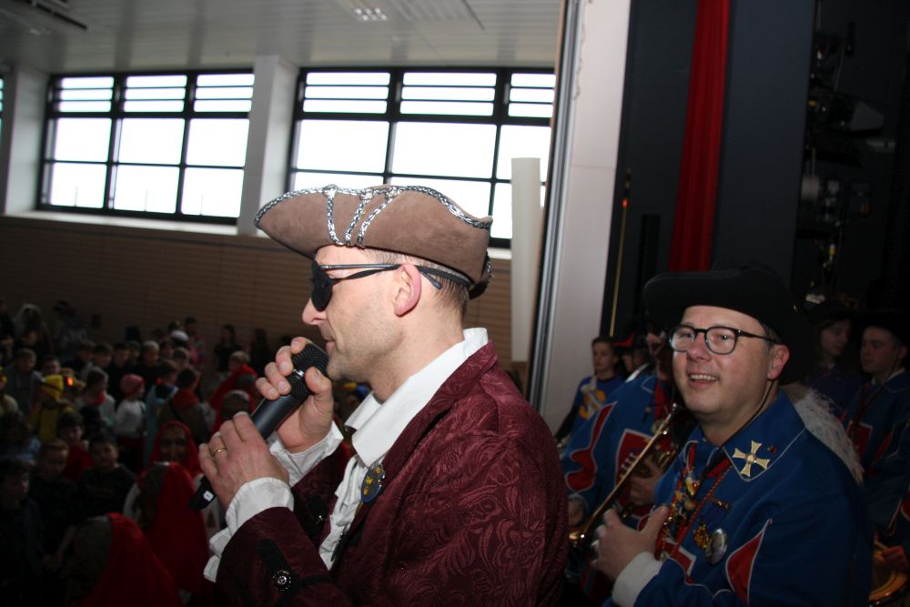 Mit großem Lärm und Dschinderassabumm stürmte die Schar das Schulhaus, durchstreifte sämtliche Stockwerke, Treppenhäuser und Gänge und riss die Schüler aus dem hochkonzentrierten Unterricht. In langem Zug ging es dann hinüber in die Remshalle, wo alles in ein buntes Faschingstreiben mündete, zunächst unter Kommando der Haugga Narra und Holger Franke, und als diese dann weiterzogen, mit unserem wieder genesenen Herrn Schrader, nachdem er im vergangenen Jahr mit lädierter Schulter ausgefallen war, als Stimmungskanone. Die "Zappelkids" und die Kindergarde der Schönbrunnennnarren des TSV Essingen bereichtern das Bühnenprogramm.