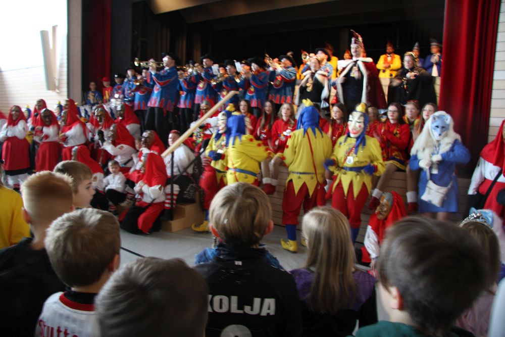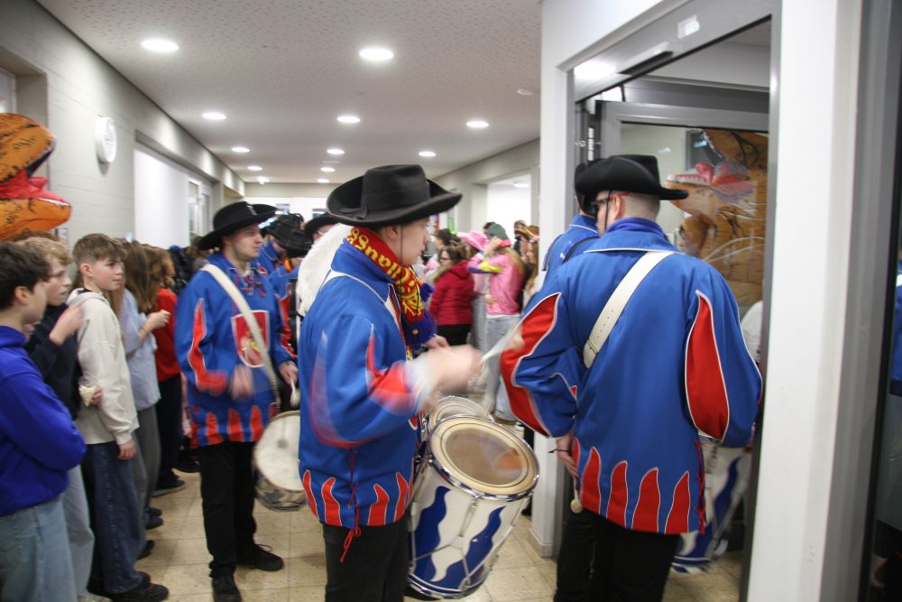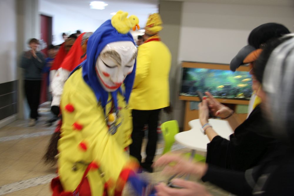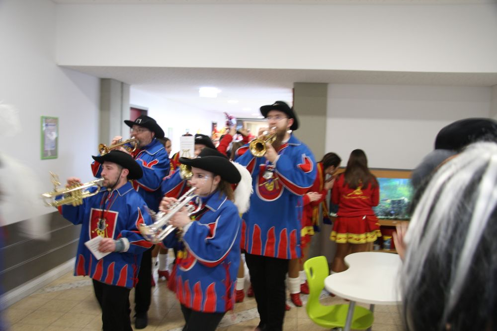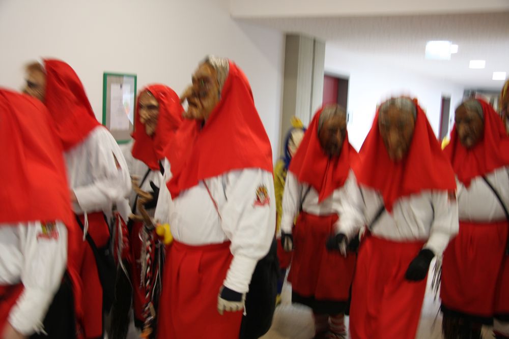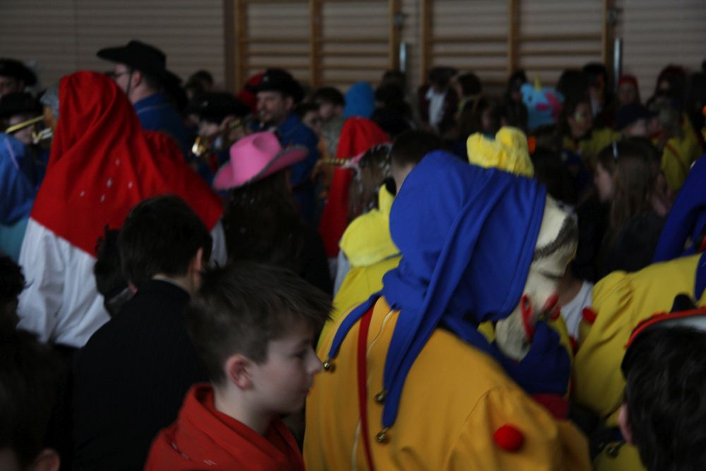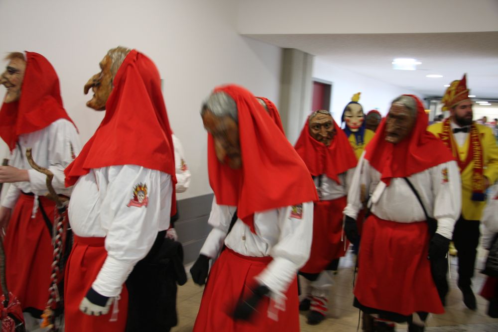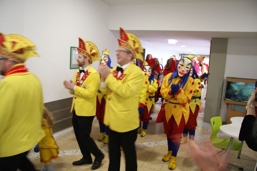 Pünktlich um halb 10, nach der großen Pause, kamen sie in Scharen und fielen wie ein Heuschreckenschwarm über die Schule her: die Haugga Narra, samt Fanfarenzug, Prinzessin, Ritter Haugg und Maskengruppe, die Oberburghexen mit ihren grausligen Masken, und da und dort waren welche in der Gardeuniform und Fuchsmasken der Schönbrunnennarren des TSV zu sehen.