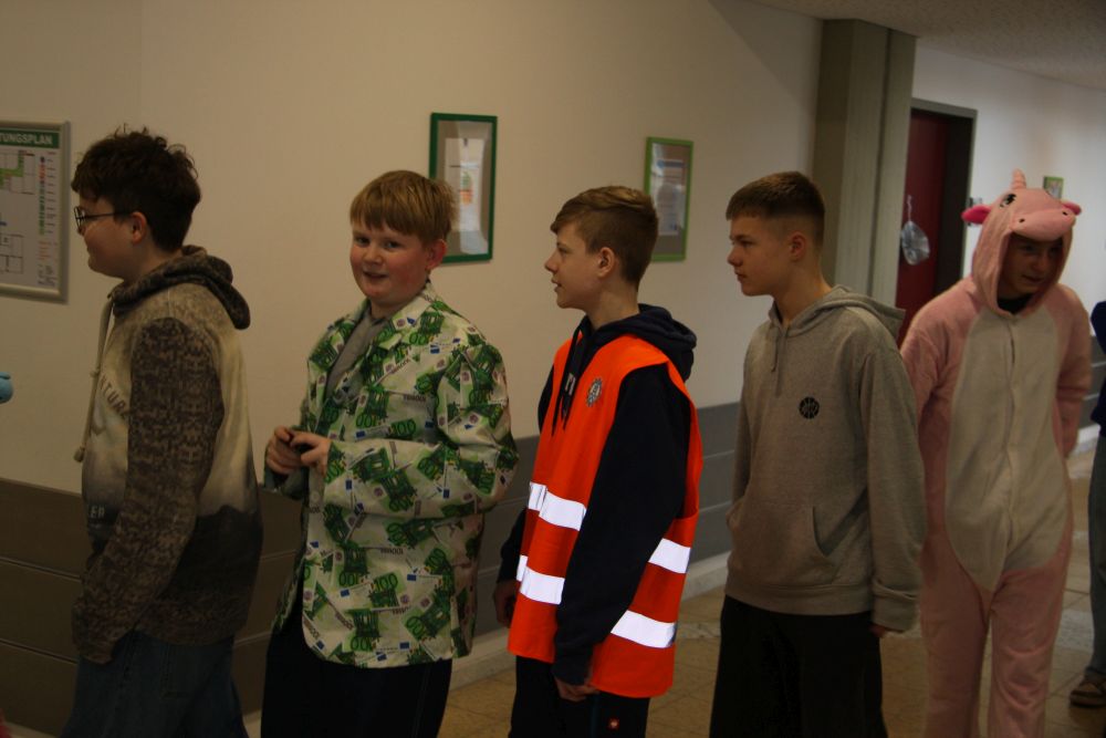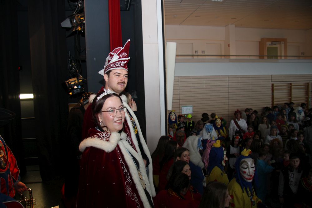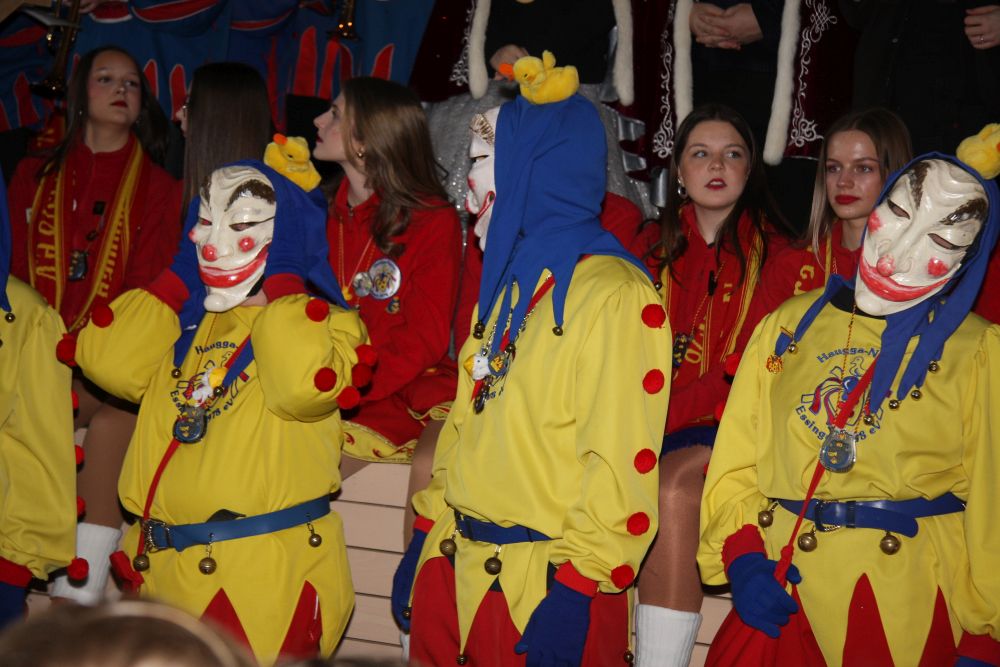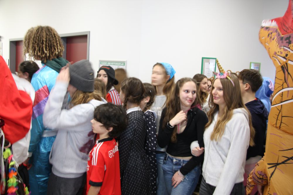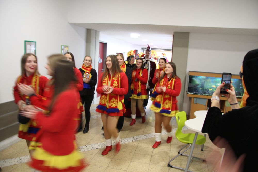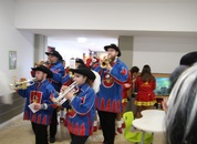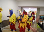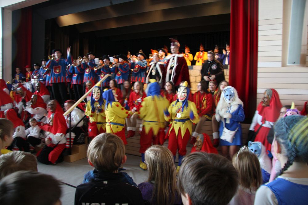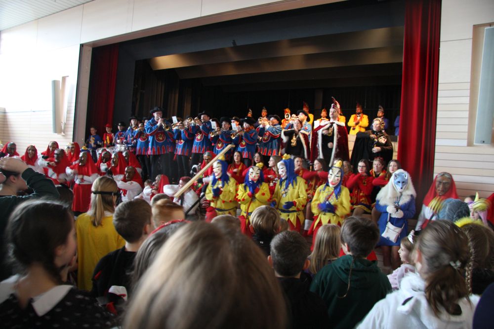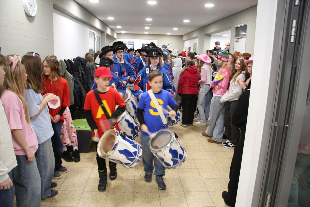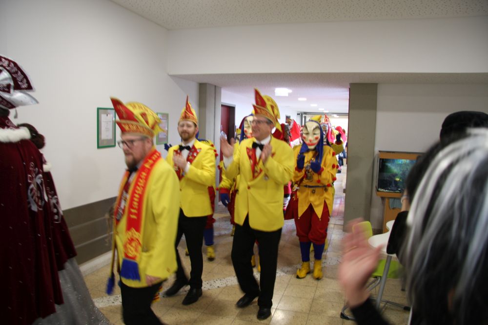 Pünktlich um halb 10, nach der großen Pause, kamen sie in Scharen und fielen wie ein Heuschreckenschwarm über die Schule her: die Haugga Narra, samt Fanfarenzug, Prinzessin, Ritter Haugg und Maskengruppe, die Oberburghexen mit ihren grausligen Masken, und da und dort waren welche in der Gardeuniform und Fuchsmasken der Schönbrunnennarren des TSV zu sehen.
