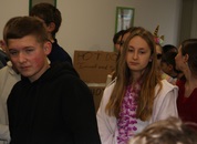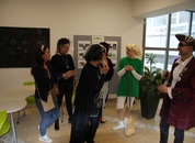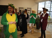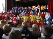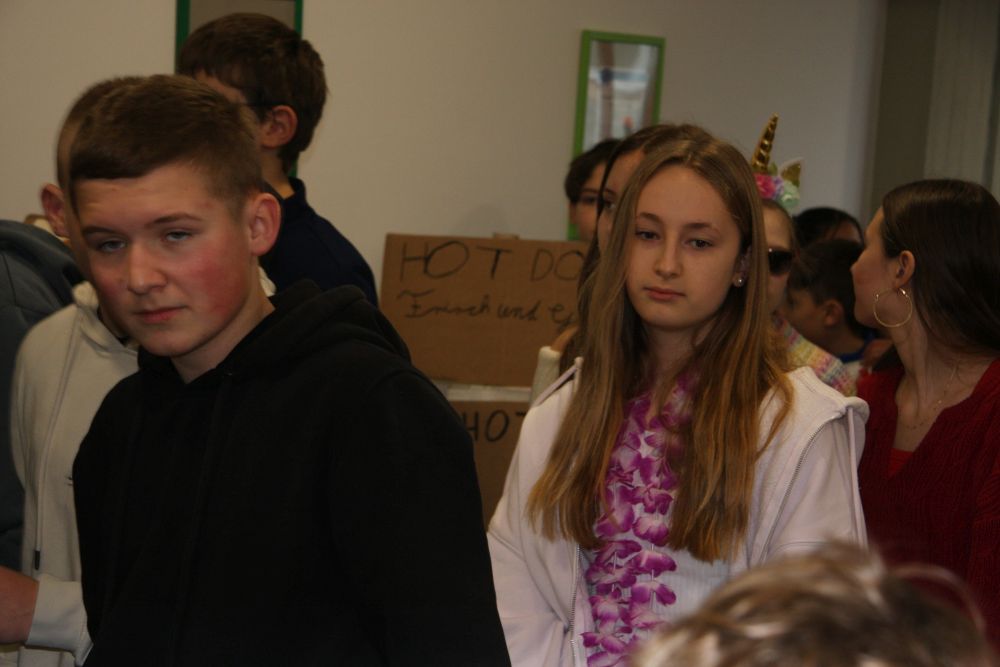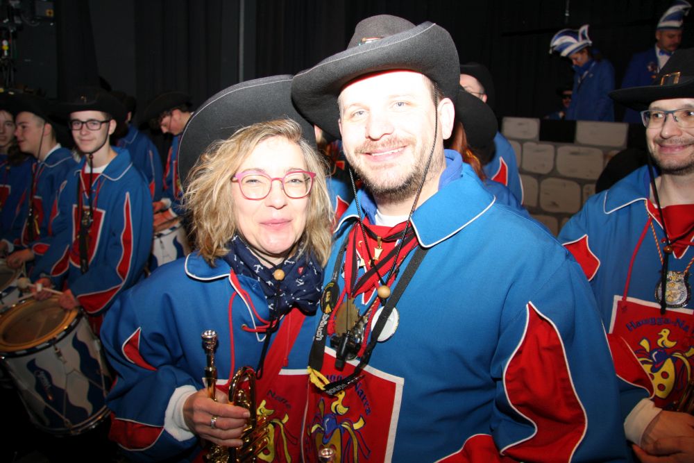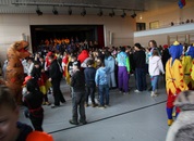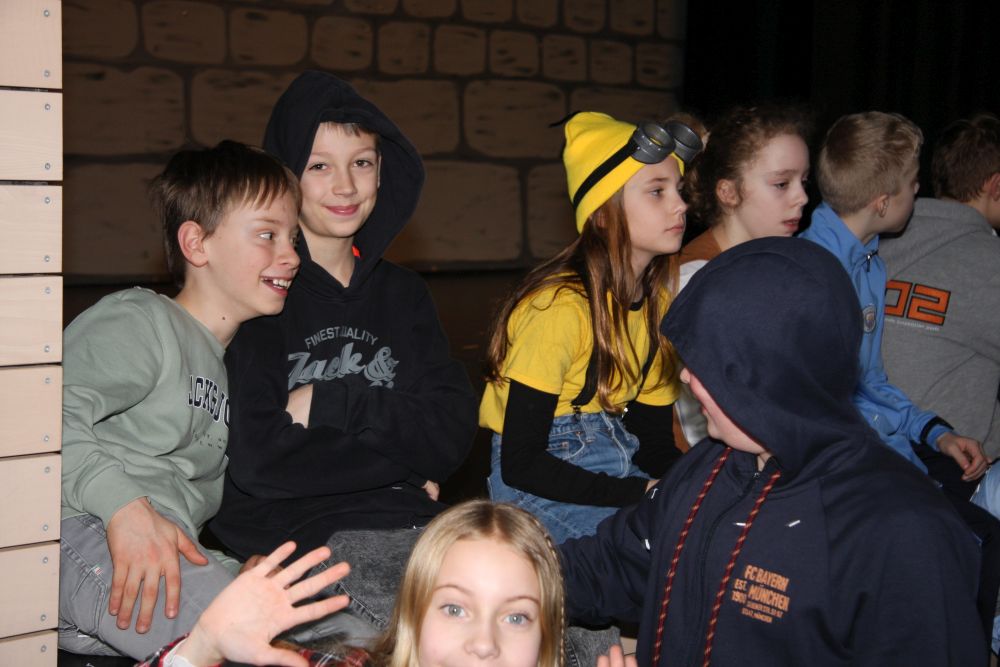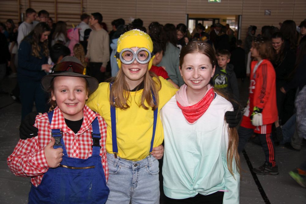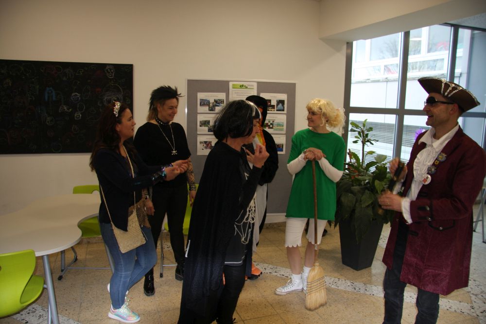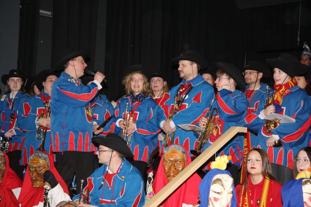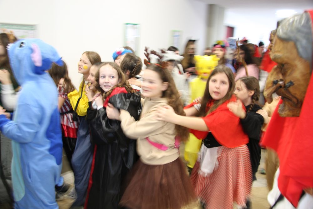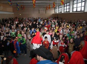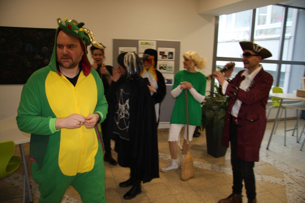 Pünktlich um halb 10, nach der großen Pause, kamen sie in Scharen und fielen wie ein Heuschreckenschwarm über die Schule her: die Haugga Narra, samt Fanfarenzug, Prinzessin, Ritter Haugg und Maskengruppe, die Oberburghexen mit ihren grausligen Masken, und da und dort waren welche in der Gardeuniform und Fuchsmasken der Schönbrunnennarren des TSV zu sehen.