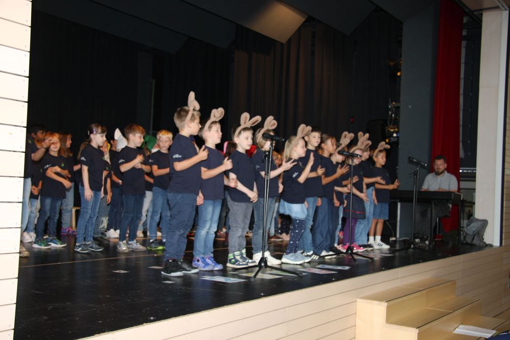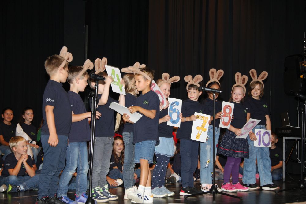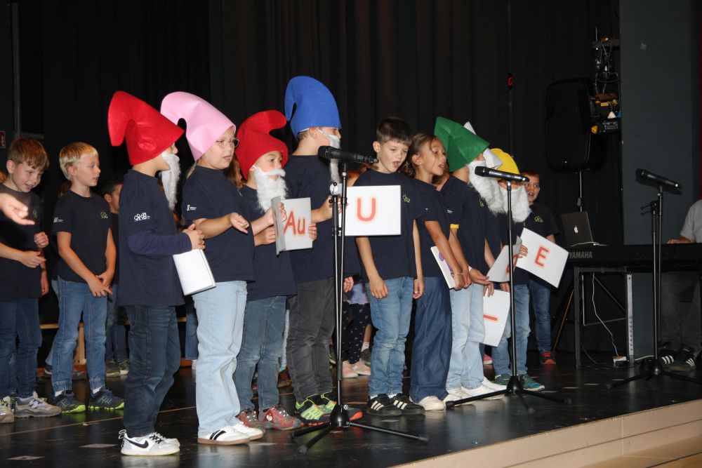 Die Zweitklässler begrüßten die Erstklässler mit schwungvoller Musik und fröhlichen Spielszenen. Die Häschen und die Zwerge lenten die Zahlen und die Buchstaben.