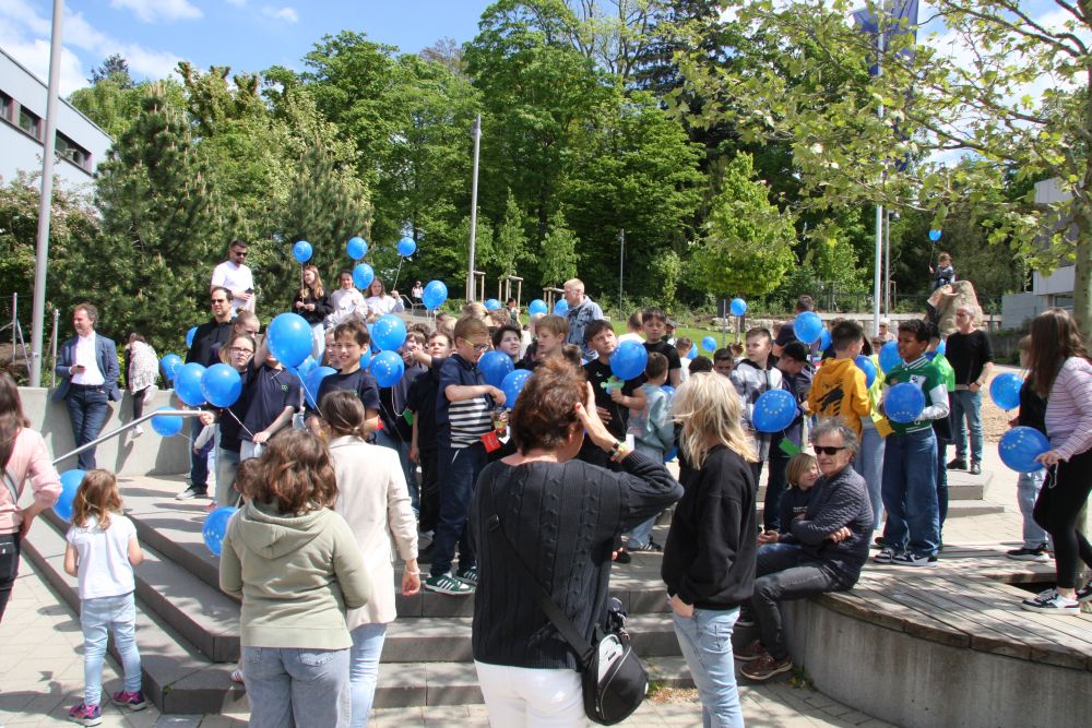 Luftballonstart - Preisträger der Parkschule auf Kreisebene - Landespreisträger - Landespreisträgerinnen mit Bundesnominierung Bellienne Brendle und Norah Neuberger - Bundespreis für Eliah Oestreich, vordere Reihe ganz rechts.