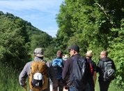 Speleologin Gabriele Bitzer von der Höhlenkundlichen Arbeitsgemeinschaft Rosenstein wanderte mit ihrem Teil der Gruppe übers Rosensteinplateau weiter in Richtung Osten zum Finsteren Loch. Dort erhielten die Teilnehmer eine Vielfalt an Informationen zur Höhlenentstehung, zur Höhlenfauna und zur Arbeit und Ausrüstung eines Höhlenforschers. Das Finstere Loch ist mit 140 Metern Länge die längste der ca. 30 bekannten Höhlen des Rosensteinmassivs. „Sie verfügt, neben den beiden natürlich entstandenen Mundlöchern im Süden und Nordosten, über einen weiteren seitlichen Zugang, durch den Tageslicht in die Höhlen fällt. Die Höhle weitet sich kurz hinter dem südlichen Eingang in eine bis zu 17 m breite und 5 m hohe Halle. Über einen Versturz führt der Höhlengang weiter, wird schmaler, niedriger, steigt an und mündet nach etwa 50 m in einer weiteren, nun 36 m langen und bis zu 6,5 m breiten