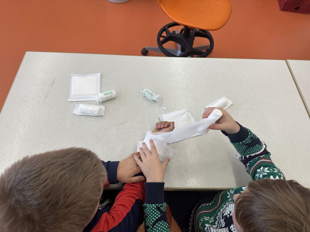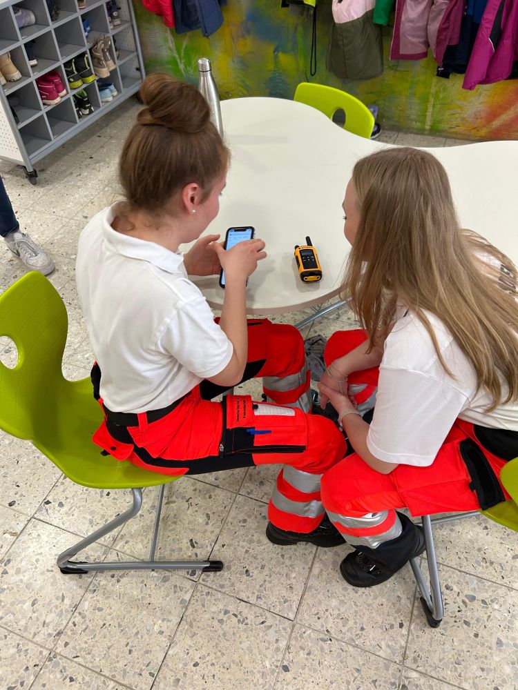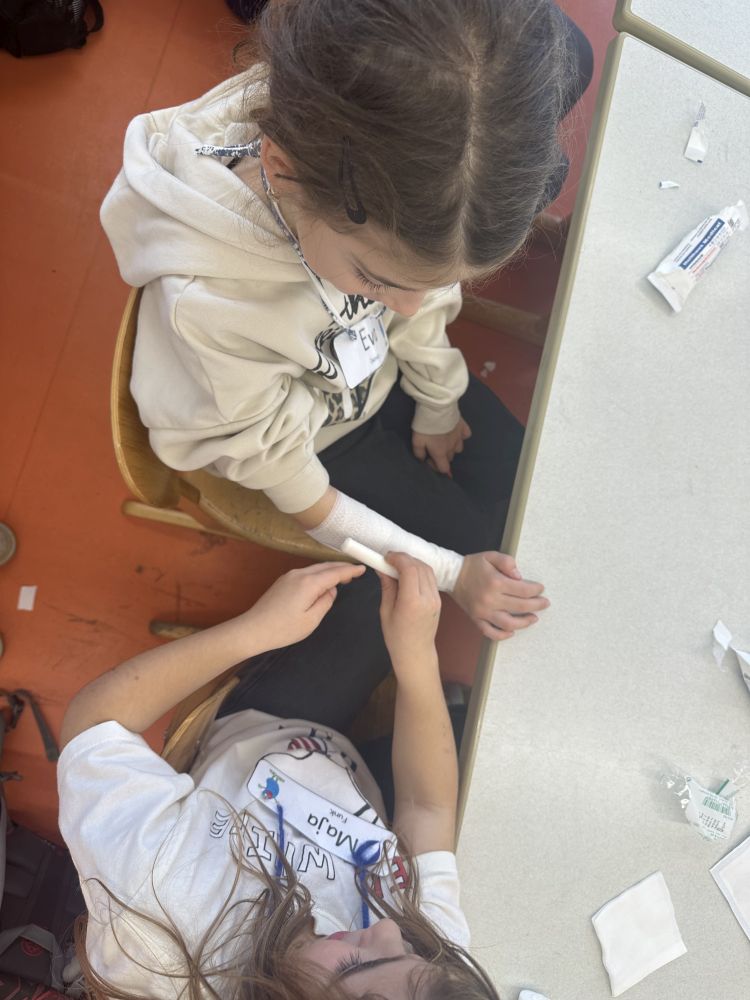 In verschiedenen Stationen konnten die Kinder wichtige Grundlagen der Ersten Hilfe kennenlernen. Sie legten Verbände und Pflaster an, übten die stabile Seitenlage und setzten mit viel Begeisterung Notrufe über Walkie-Talkies