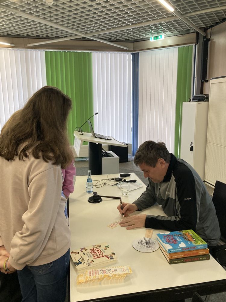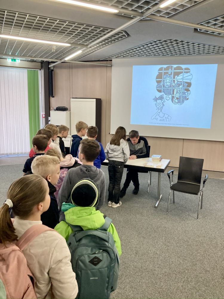 Seine Lesung war lebendig, spannend und vor allem sehr witzig. Die Kinder tauchten begeistert in die Geschichte ein und waren mit großem Feuereifer dabei. Besonders gefreut haben sich alle über ein Lesezeichen der Buchreihe – mit einer Original-Unterschrift des Autors.