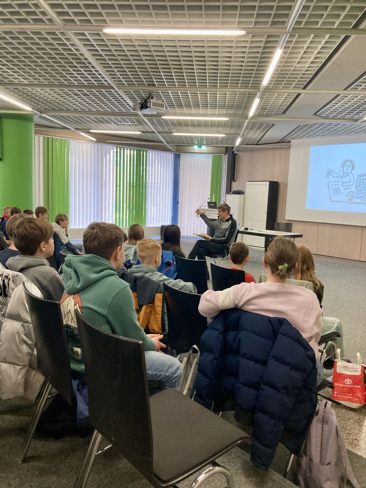 Am Montag, den 09.03., waren die Klassen 4a und 4b zu Gast in der Stadtbibliothek Aalen. Im Rahmen der jährlichen Kinder- und Jugendliteraturtage Aalen las der Autor Markus Orths aus seiner Reihe „Crazy Family“.
