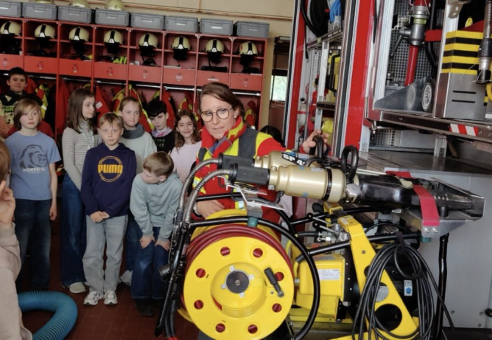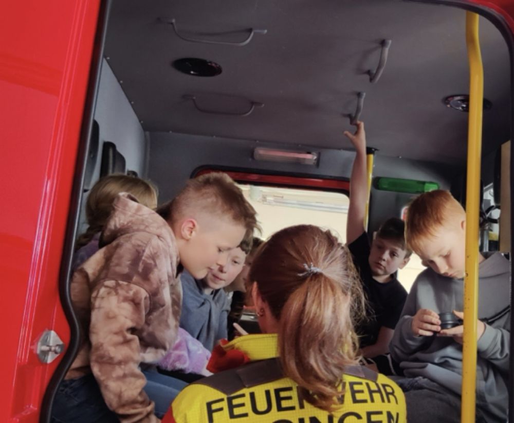 Die Schülerinnen und Schüler durften sich in einen der Einsatzwagen setzen und lernten viel über die Ausrüstung der Feuerwehrleute und deren Einsätze kennen.