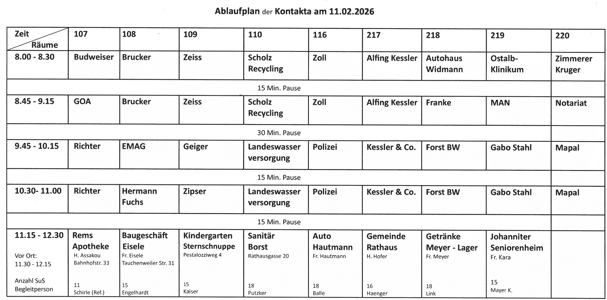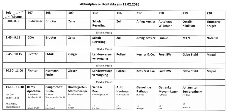 Gesamtübersicht Kontakta Mo 09.02. bis Fr 13.02.2026 Montag Dienstag Mittwoch Donnerstag Freitag Klassen 9 Infos und Training Assessment Center Herr Krieg, Barmer Klasse 7ab Benimmkurs AJO 3 Personen 8.00 – 11.00 Uhr 7a: 8.00 – 9.30 Uhr 7b: 9.30 – 11.00 Uhr Klasse 8 Bau-Info Klasse 10 Infos zu Verträgen und Tarifen in der Ausbildung und auf dem Weg zur Selbstän-digkeit Klassen 7, 8, 9 „Chefs kommen in die Schule" Klasse 7c Benimmkurs AJO 3 Personen 8.00 – 11.00 Uhr 7c: 8.00 – 9.30 Uhr Klassen 8 Betriebs-besichtigung: Fa. Alfing (Kl. 8ab) Fa. Mapal (Kl. 8cd) Klasse 10 Studien-information Hochschule Aalen Klasse 9 Coaching4- future 19.3.26 9a: 9.00-10.30 9b: 11.00-12.30 Klasse 9 und 10 Bundeswehr (Teilnahme freiwillig) Klassen 9a Agentur für Arbeit 13.30 – 15.00 Uhr Kl.zi. 9a Fr. Reizig Klassen 8 13.30 – 14.30 Uhr Informationen über weiterführende und berufliche Schulen 14.30 – 15.00 Uhr Ehemalige Parkschüler Klassen 5 und 6 2-Felder-Ball Turnier Orga: Schrader Klassen 9b Agentur für Arbeit 13.30 – 15.00 Uhr Kl.zi. 9b Fr. Reizig