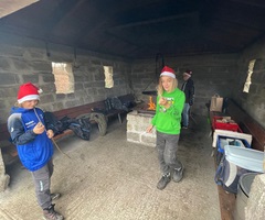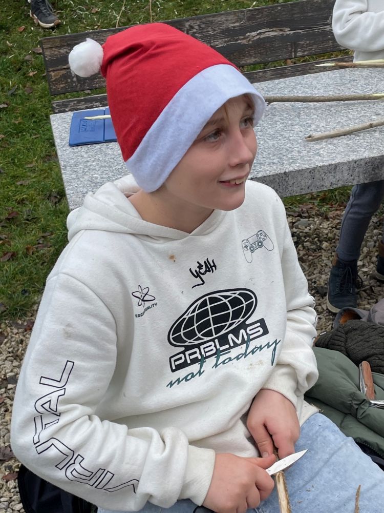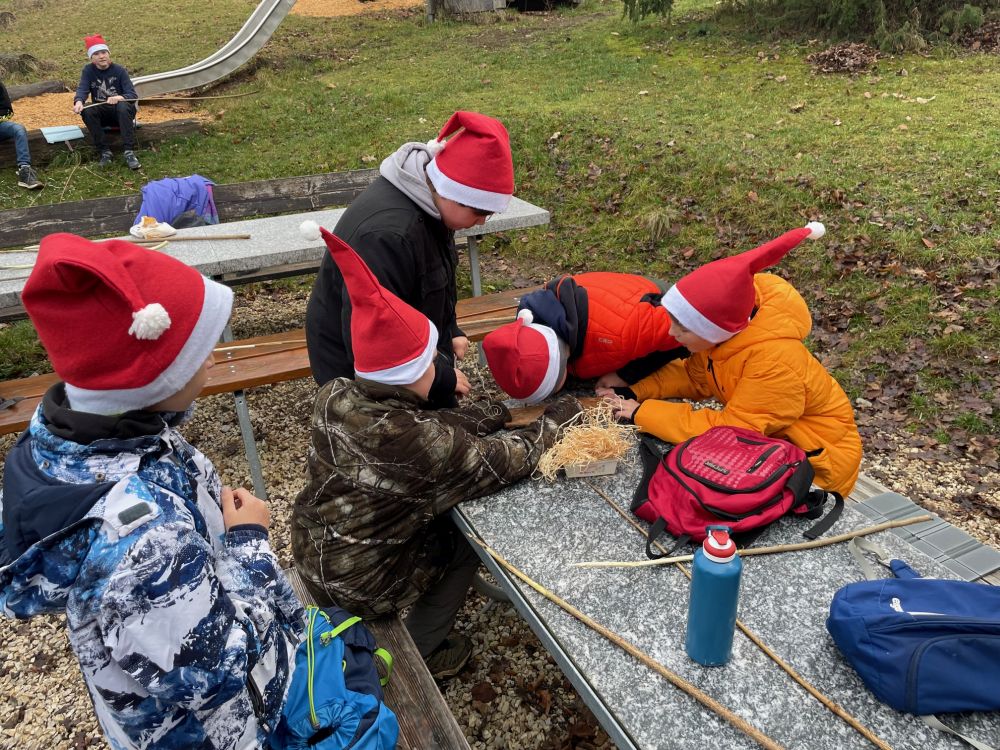 Nach dem kurzen Anstieg hinauf auf’s Essinger Köpfle wartete dort auf die 13 jugendlichen Teilnehmer eine schöne Überraschung. Die Wanderführer Angelika und Jakob Tittl von der Albvereinsortsgruppe Essingen erwarteten die Schülerinnen und Schüler in der dortigen Grillhütte mit einem vorbereiteten Lagerfeuer, Würstchen und heißem Kinderpunsch. Bevor man sich jedoch ans Grillen machen konnte, musste von den Kids erst mit einer steinzeitlichen Feuersäge ein Feuer entfacht und mit den mitgebrachten Taschenmessern die Grillstecken geschnitzt werden. Mit geselligen Spielen, einer spannenden Schatzsuche rund um den tollen Spielplatz und der einen oder anderen dampfenden Tasse Punsch vertrieb man sich die Zeit bis die ersten Würste dann knusprig gegrillt und verzehrbereit waren.