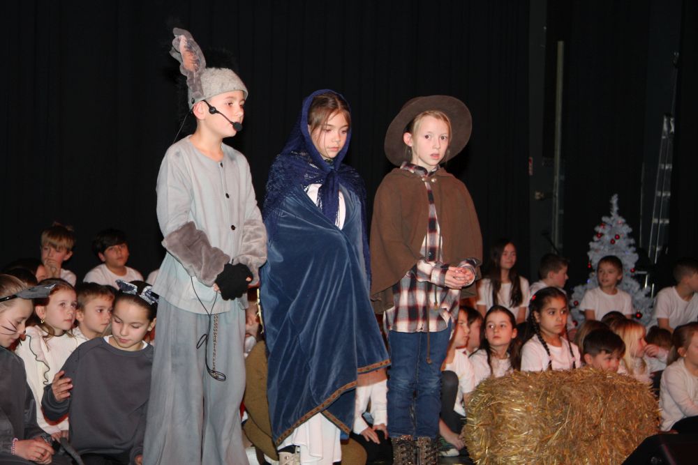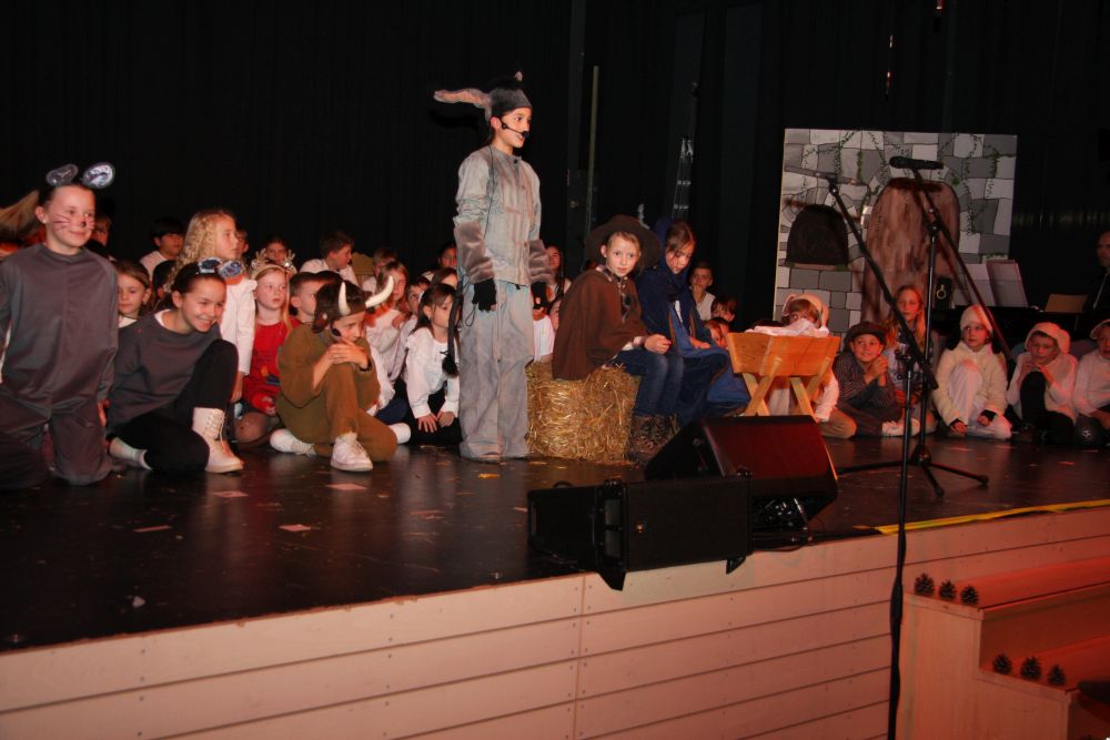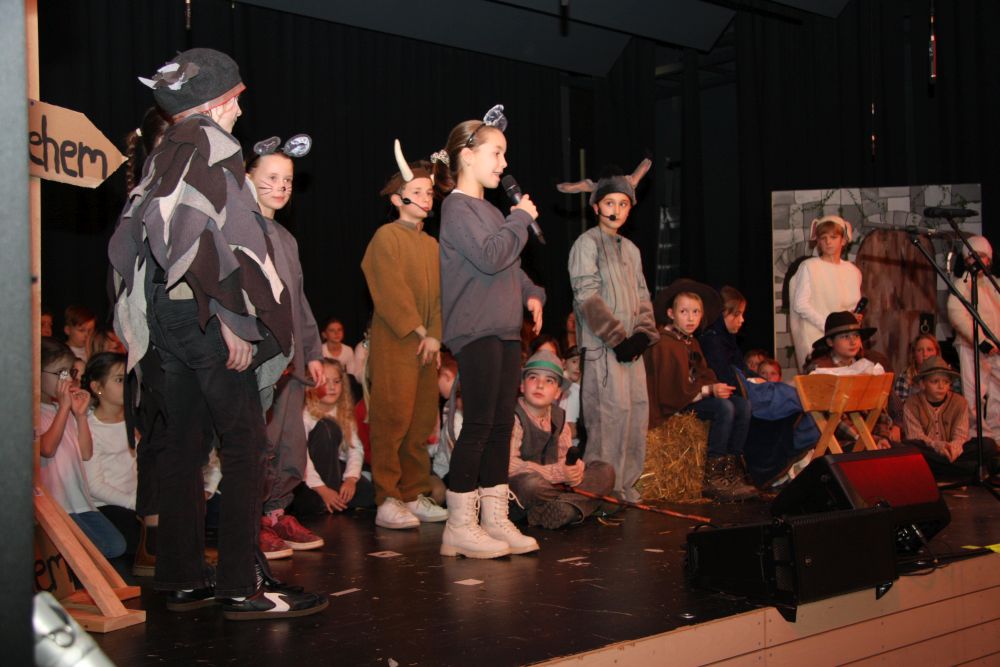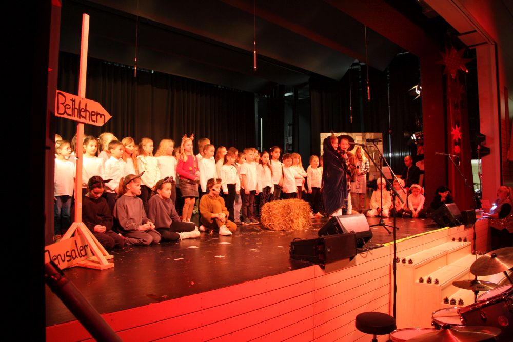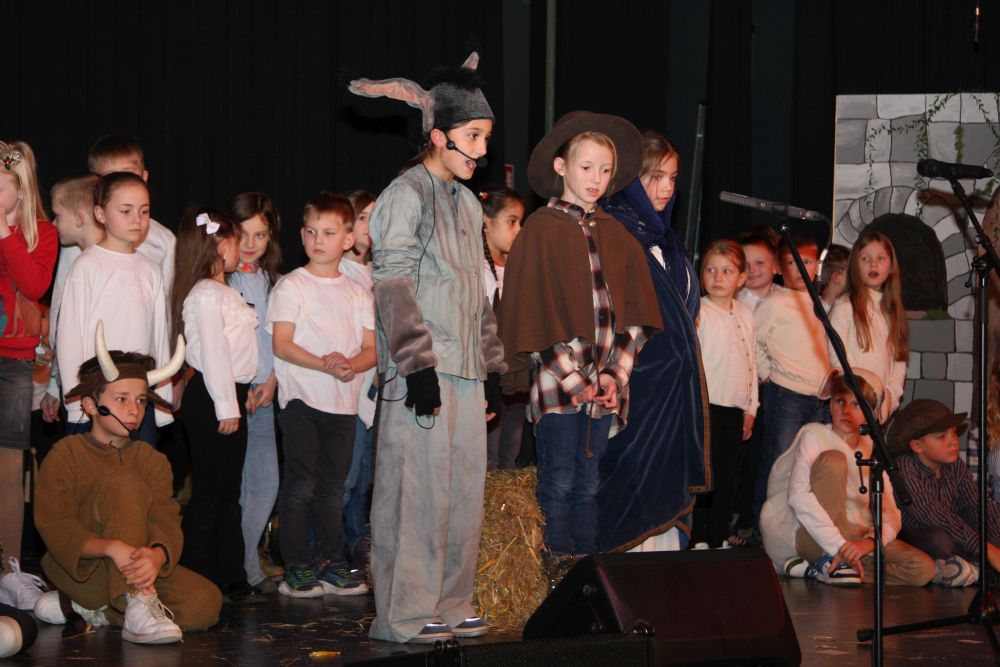 Ausschnitte aus dem Kindermusical „Spezialauftrag für einen Esel“ präsentierten alle ersten und vierten Klassen, intensiv einstudiert von ihren Klassenlehrerinnen Hiller, Göbelt, Adams, Herzog und Paul, sowie Johannes Fischer aus der Sekundarstufe am E-Piano. Das Weihnachtsgeschehen um Jesus, Maria und Josef wird aus der Sicht des Esels Joschi dargestellt.