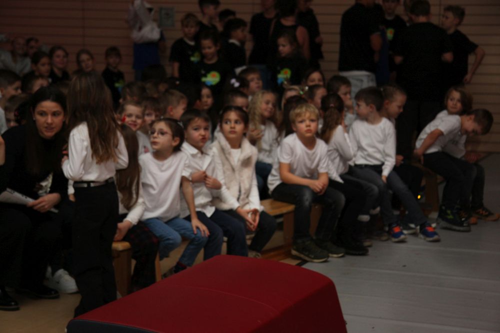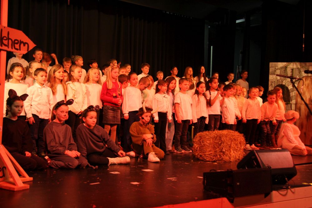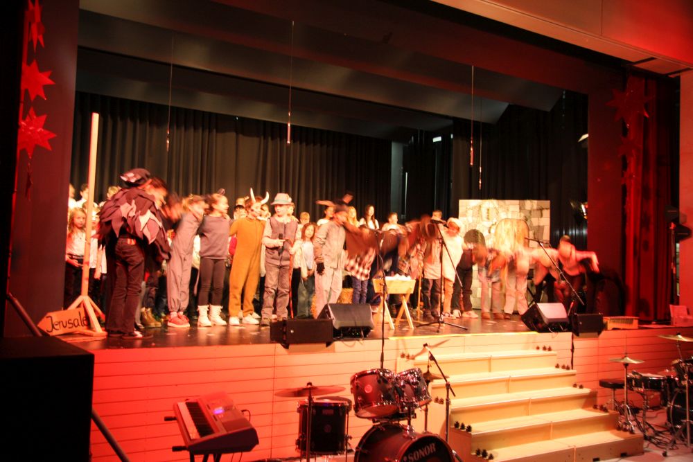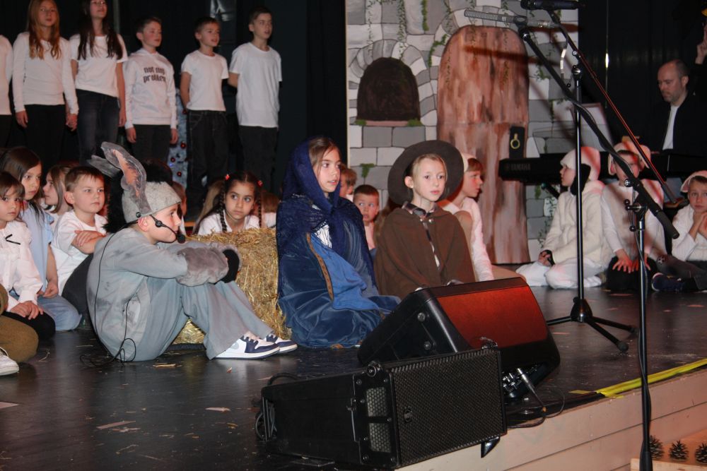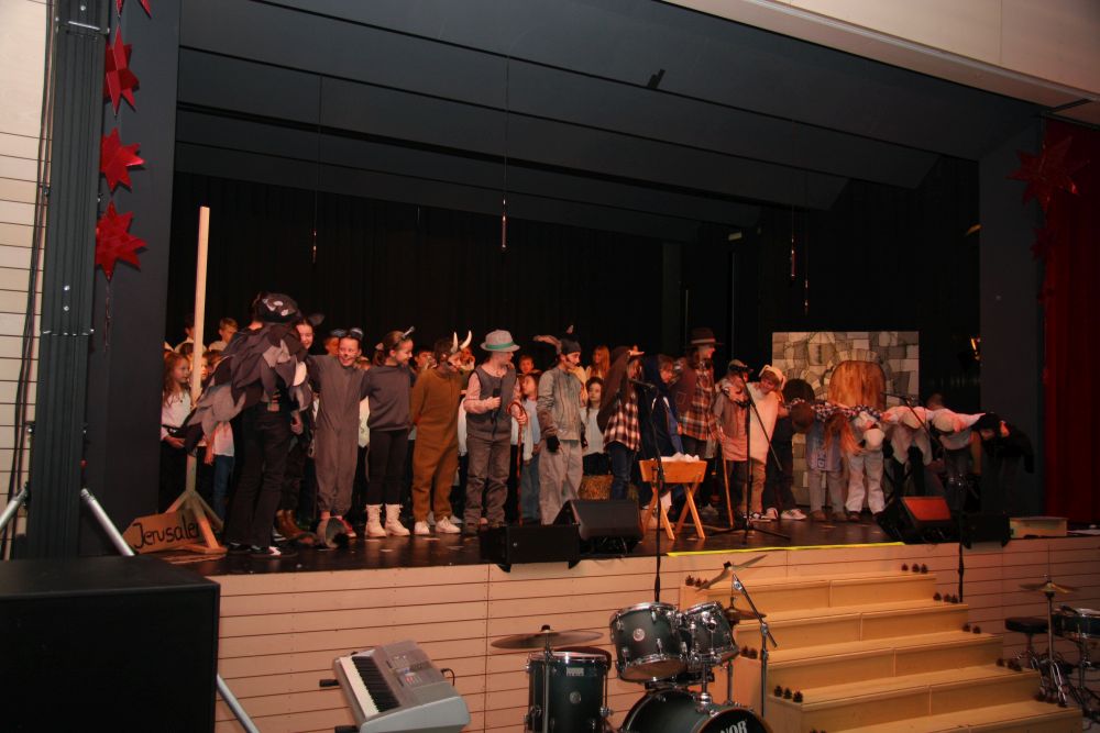 Ausschnitte aus dem Kindermusical „Spezialauftrag für einen Esel“ präsentierten alle ersten und vierten Klassen, intensiv einstudiert von ihren Klassenlehrerinnen Hiller, Göbelt, Adams, Herzog und Paul, sowie Johannes Fischer aus der Sekundarstufe am E-Piano. Das Weihnachtsgeschehen um Jesus, Maria und Josef wird aus der Sicht des Esels Joschi dargestellt.
