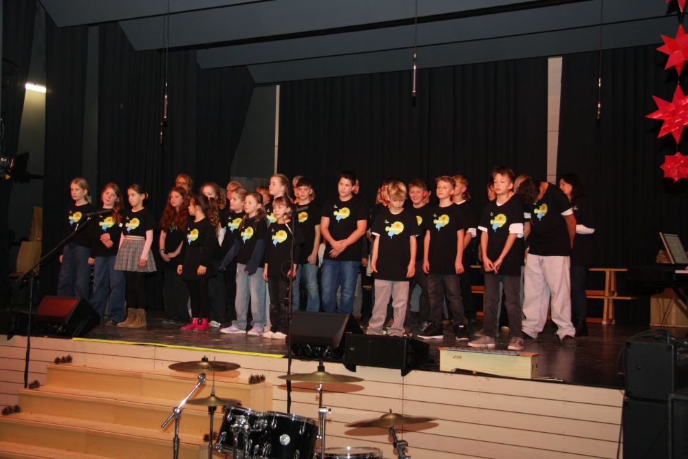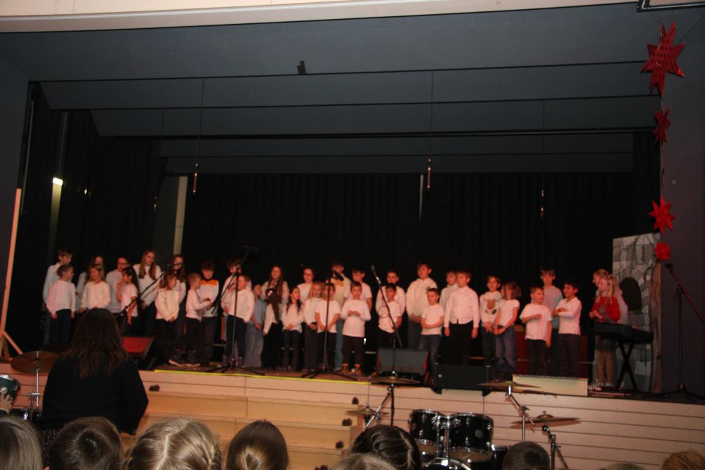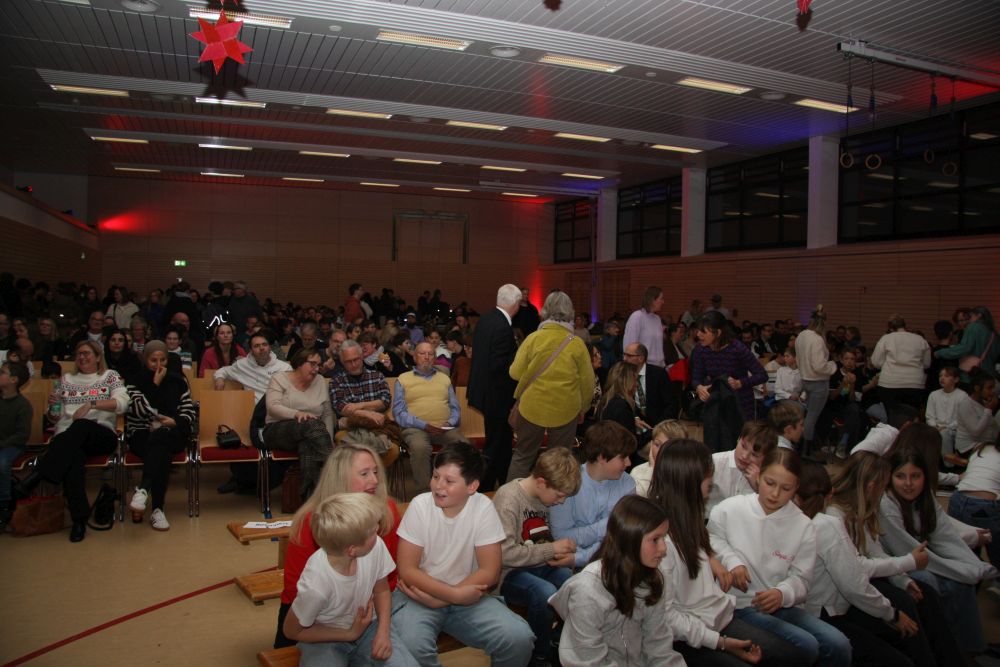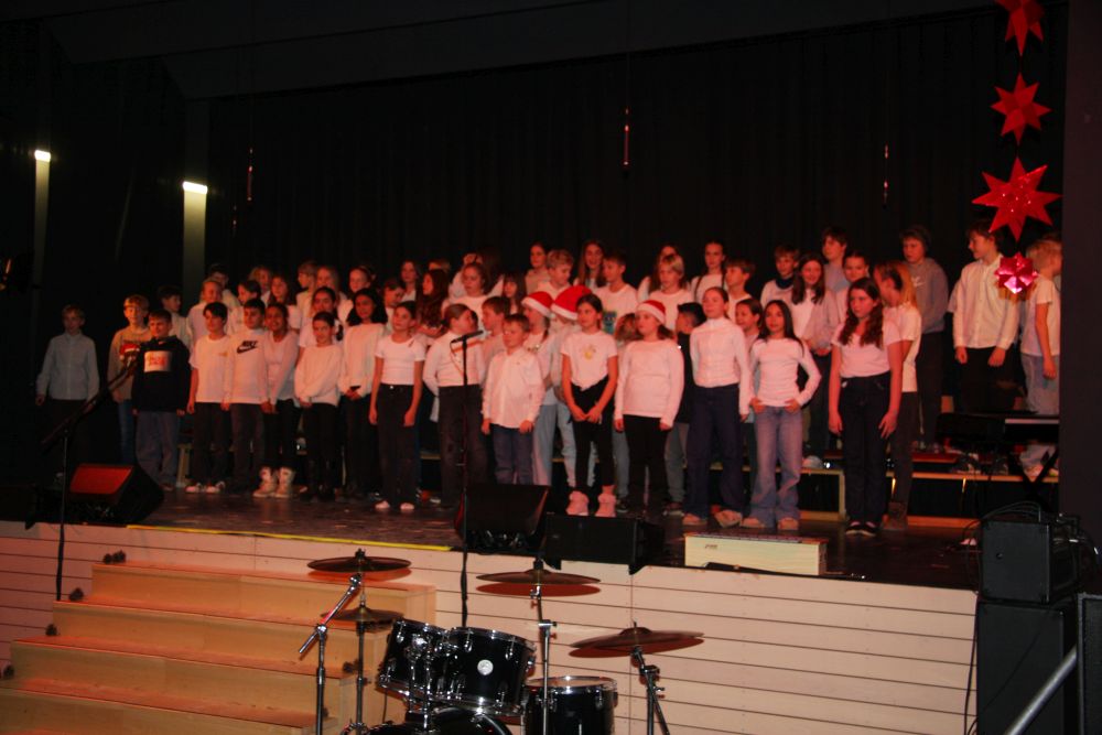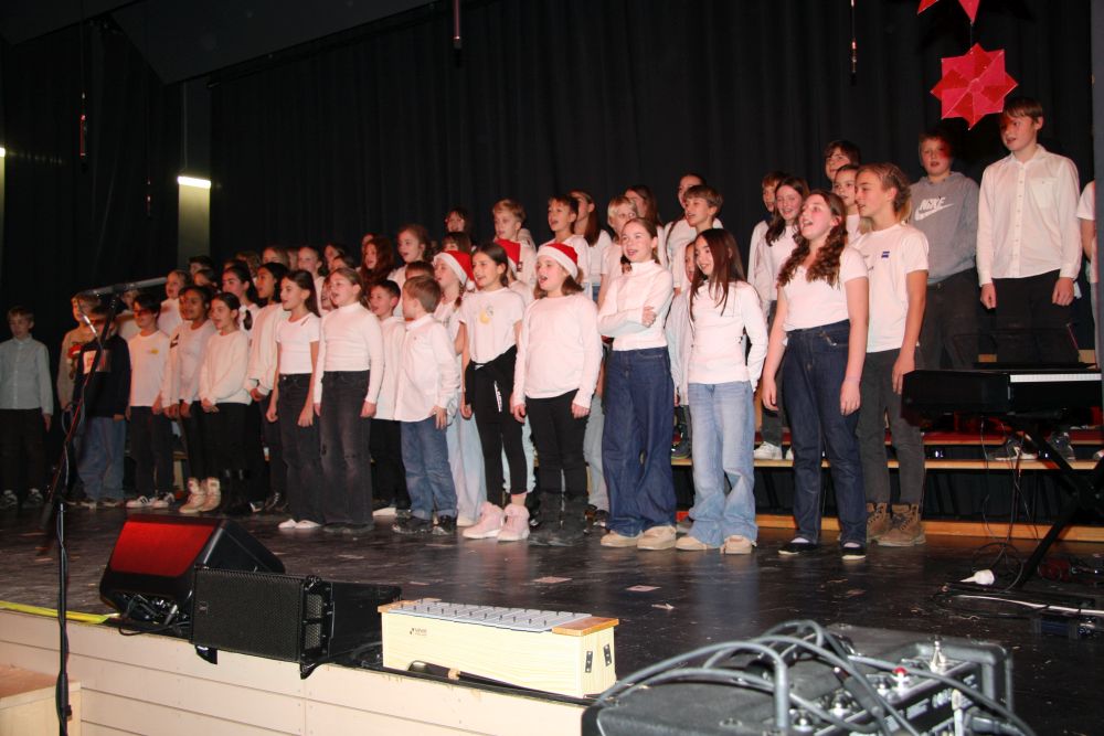 „Merry Christmas Everyone“ wünschten mit deutschem Liedtext die drei 5. Klassen ihren Zuhörern. Katharina Habrom und Marietta Fischer hatten das Lied mit den Kindern eingeübt.