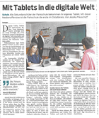besonders stabile Hülle geschützt und sind versichert. Durch die Miete können die Schülerinnen und Schüler ihre Tablets auch nach der Schule und in den Ferien mit nach Hause nehmen. Mit einer speziellen Klassen-App kann Dilek seine Schüler überwachen. Er sieht, welcher Schüler was an welchem Programm arbeitet. „Und das hier haben die Schüler natürlich gar nicht gerne“, kündigt Dilek an und berührt ein Schloss-Symbol. Prompt sind alle Tablets der Schüler gesperrt und ein Raunen geht durch die Klasse. Nun hat der Lehrer wieder die volle Aufmerksamkeit. Alle Schüler schauen zur digitalen Tafel. Dort zeigt Steffen Dilek, wie praktisch die Bedienung ist. Mit nur wenigen Schritten können so Lerninhalte von der Tafel auf die Tablets der Schüler geschickt werden. „Und das Tafelwischen entfällt auch“, fügt Michelbach lachend hinzu.