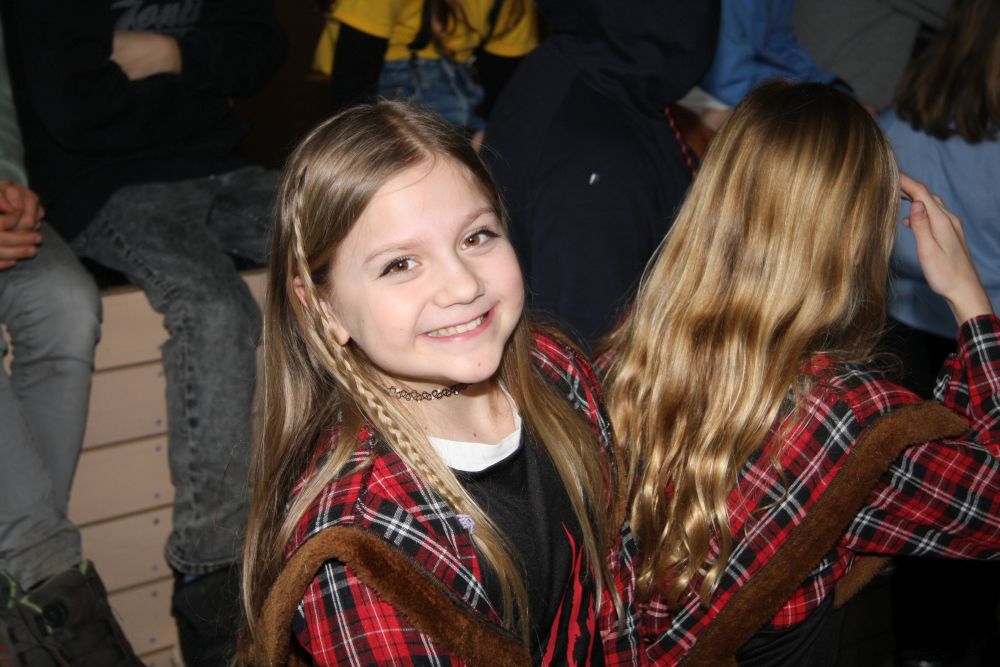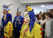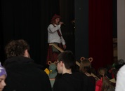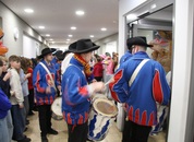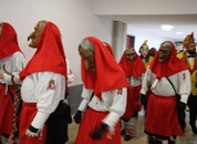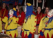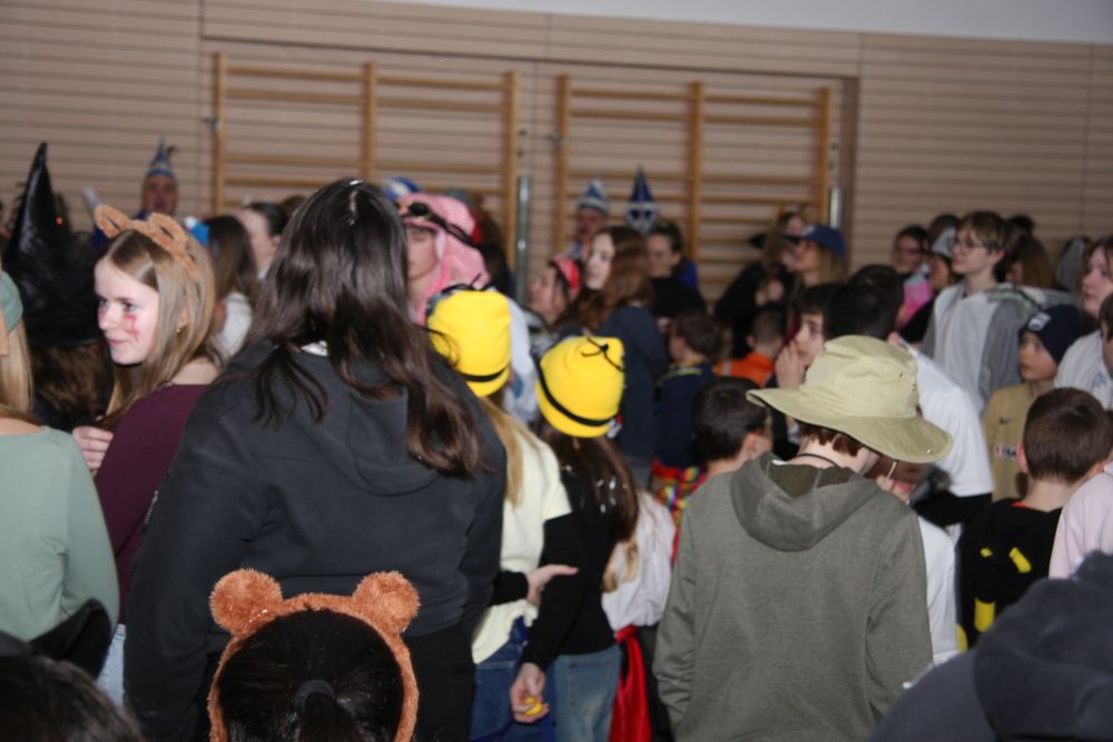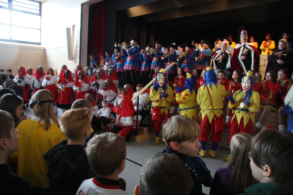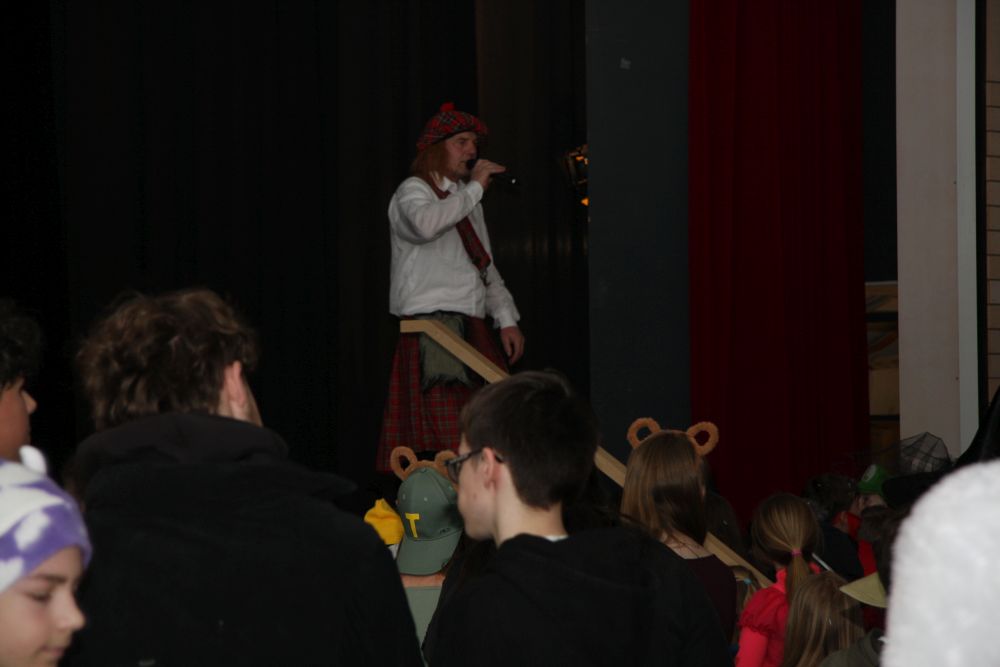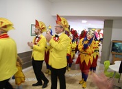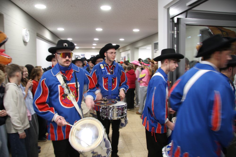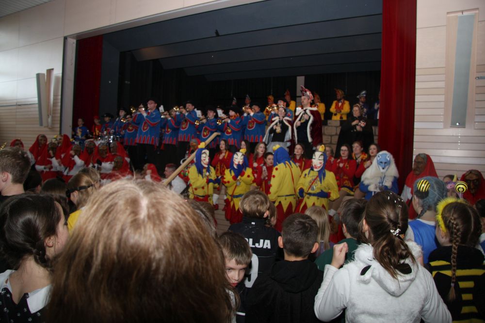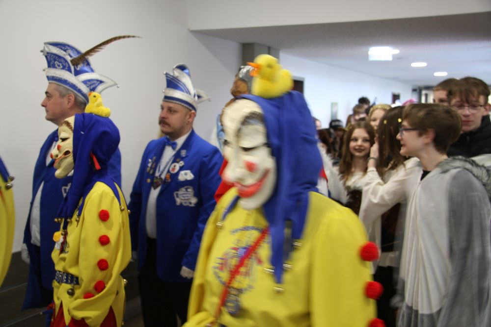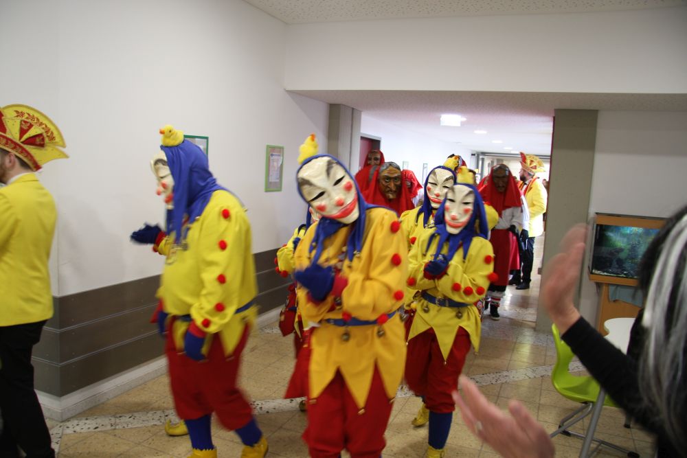 Pünktlich um halb 10, nach der großen Pause, kamen sie in Scharen und fielen wie ein Heuschreckenschwarm über die Schule her: die Haugga Narra, samt Fanfarenzug, Prinzessin, Ritter Haugg und Maskengruppe, die Oberburghexen mit ihren grausligen Masken, und da und dort waren welche in der Gardeuniform und Fuchsmasken der Schönbrunnennarren des TSV zu sehen.
