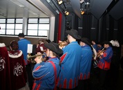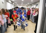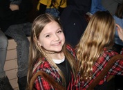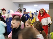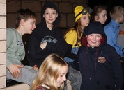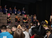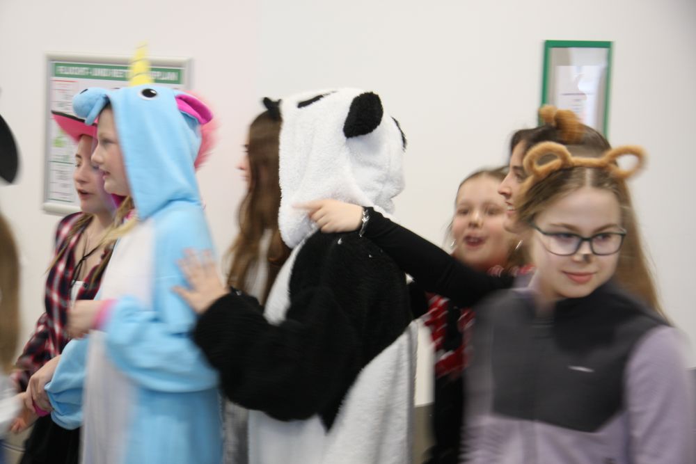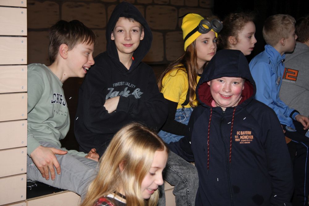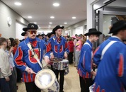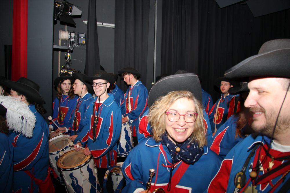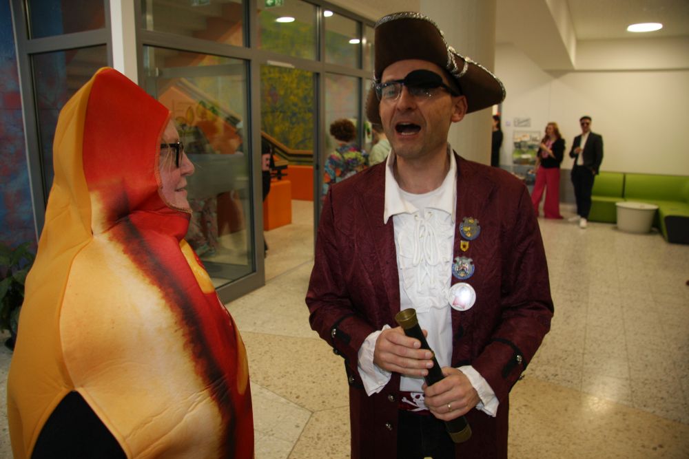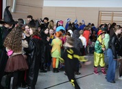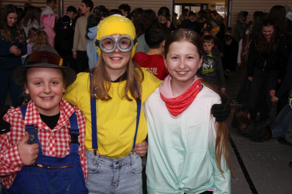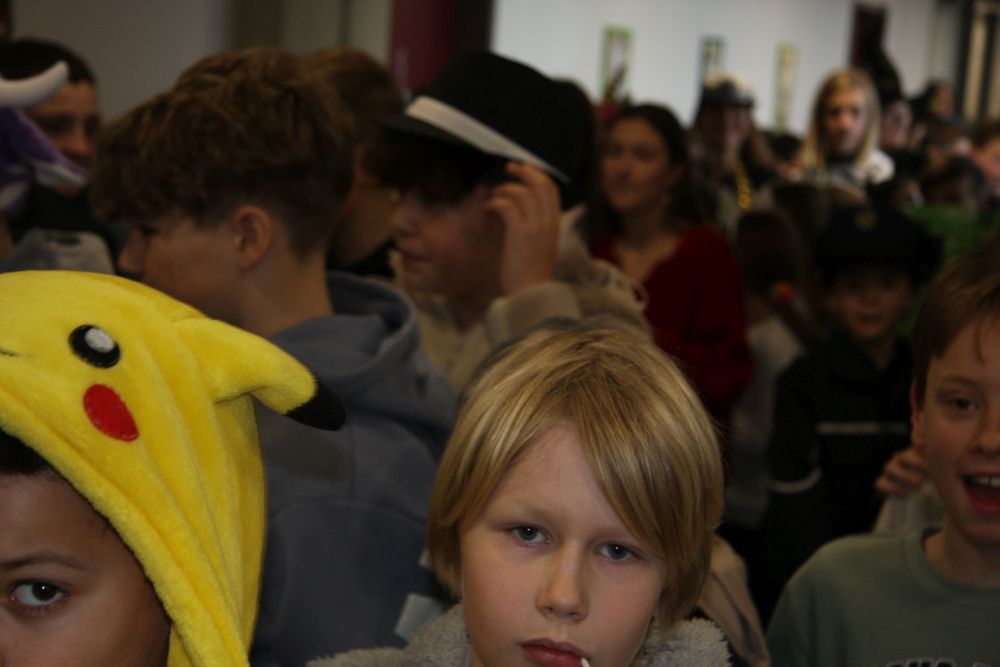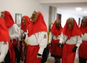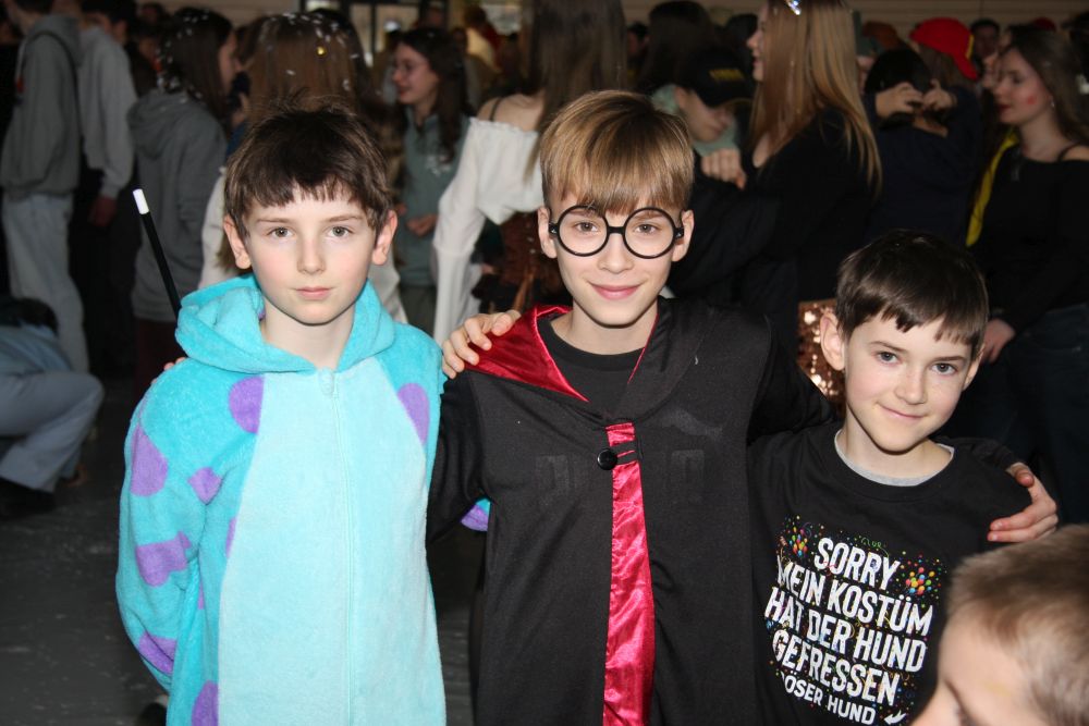 Pünktlich um halb 10, nach der großen Pause, kamen sie in Scharen und fielen wie ein Heuschreckenschwarm über die Schule her: die Haugga Narra, samt Fanfarenzug, Prinzessin, Ritter Haugg und Maskengruppe, die Oberburghexen mit ihren grausligen Masken, und da und dort waren welche in der Gardeuniform und Fuchsmasken der Schönbrunnennarren des TSV zu sehen.