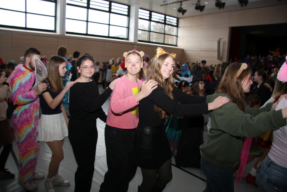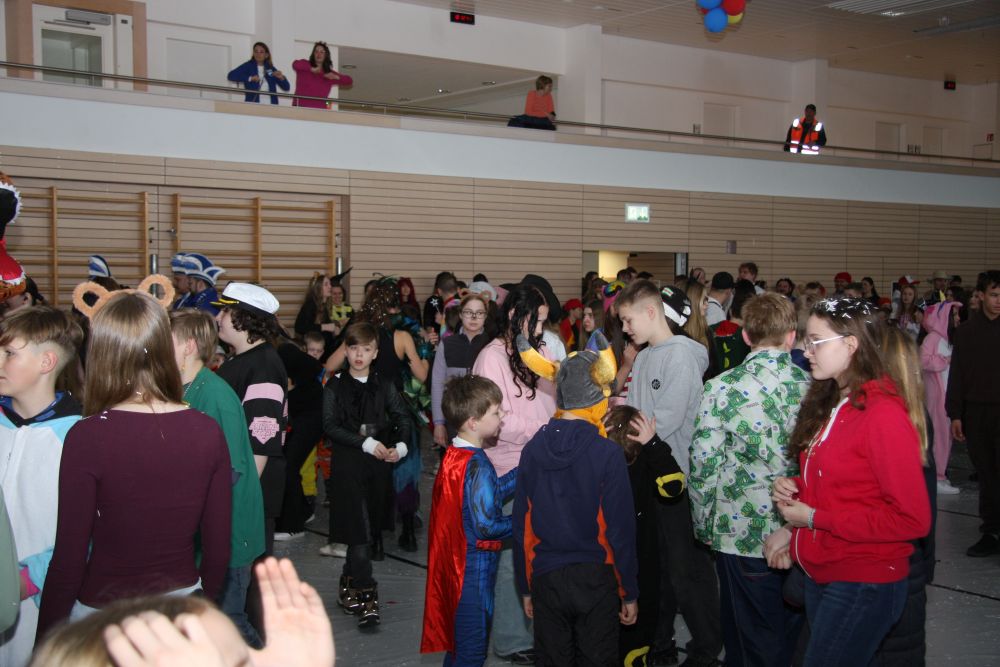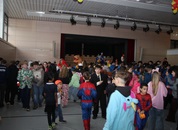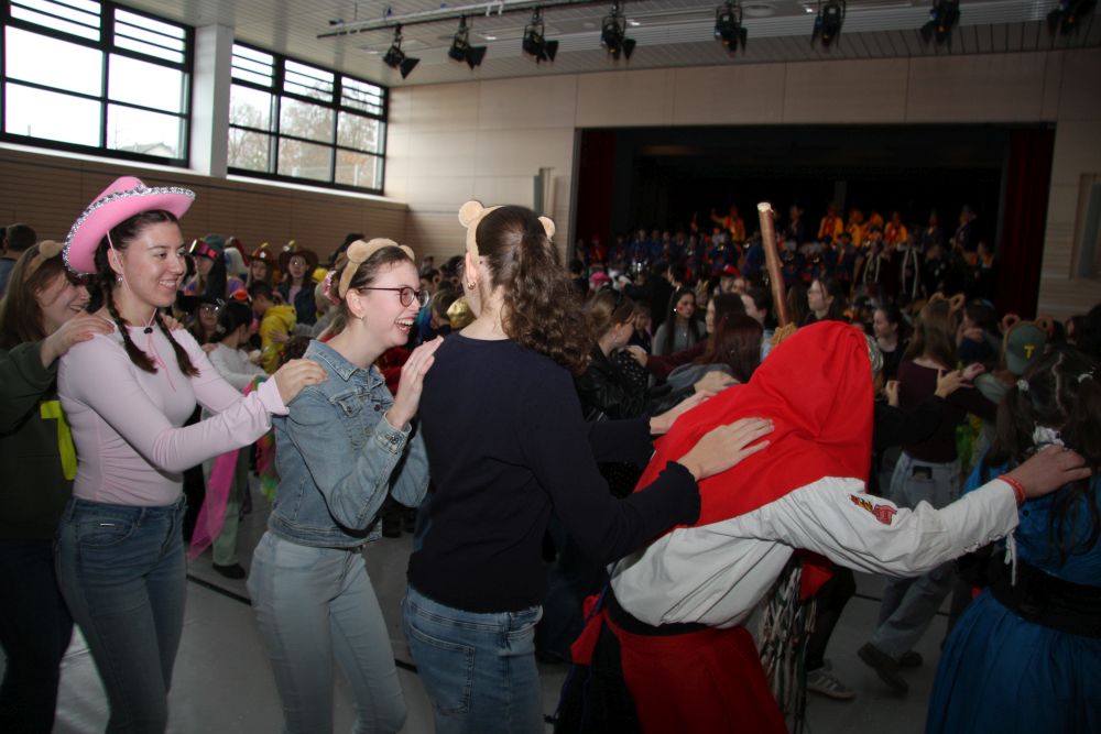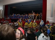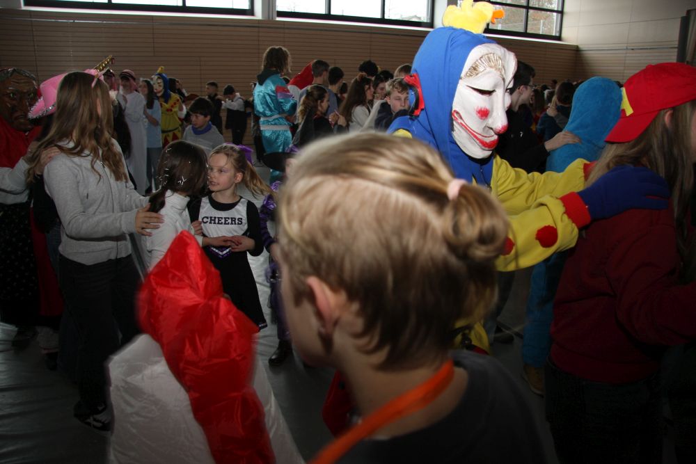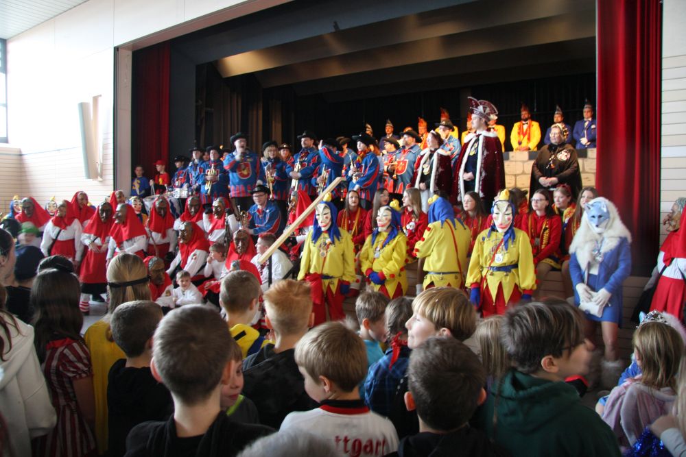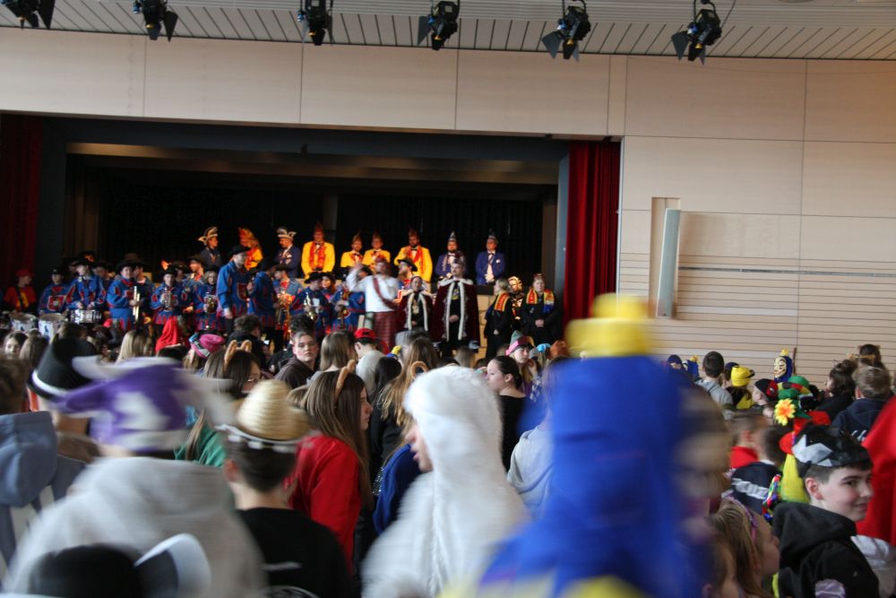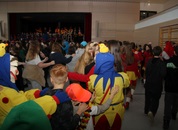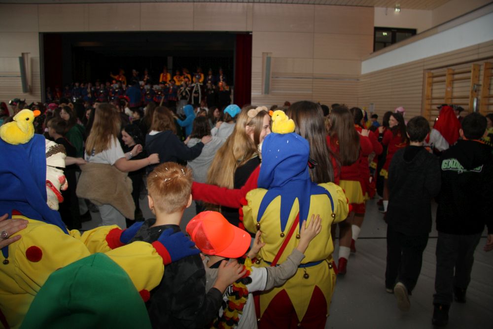 Mit großem Lärm und Dschinderassabumm stürmte die Schar das Schulhaus, durchstreifte sämtliche Stockwerke, Treppenhäuser und Gänge und riss die Schüler aus dem hochkonzentrierten Unterricht. In langem Zug ging es dann hinüber in die Remshalle, wo alles in ein buntes Faschingstreiben mündete, zunächst unter Kommando der Haugga Narra und Holger Franke, und als diese dann weiterzogen, mit unserem wieder genesenen Herrn Schrader, nachdem er im vergangenen Jahr mit lädierter Schulter ausgefallen war, als Stimmungskanone. Die "Zappelkids" und die Kindergarde der Schönbrunnennnarren des TSV Essingen bereichtern das Bühnenprogramm.