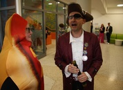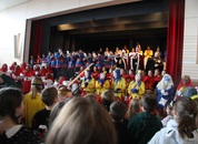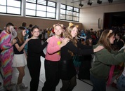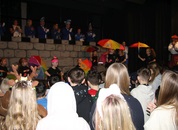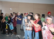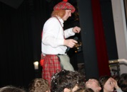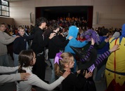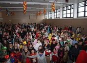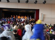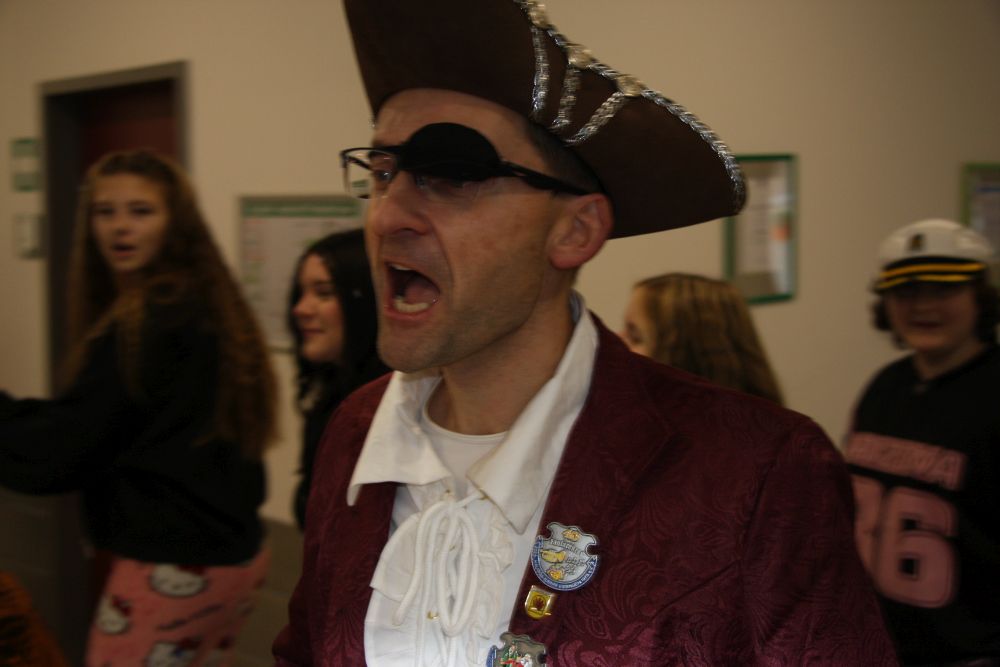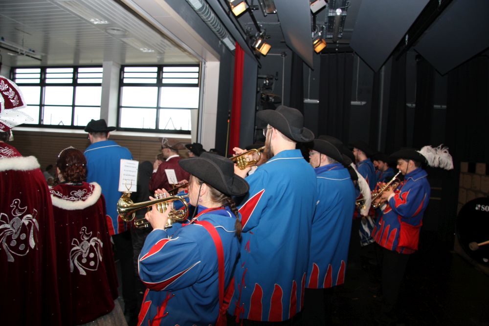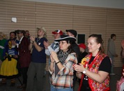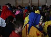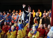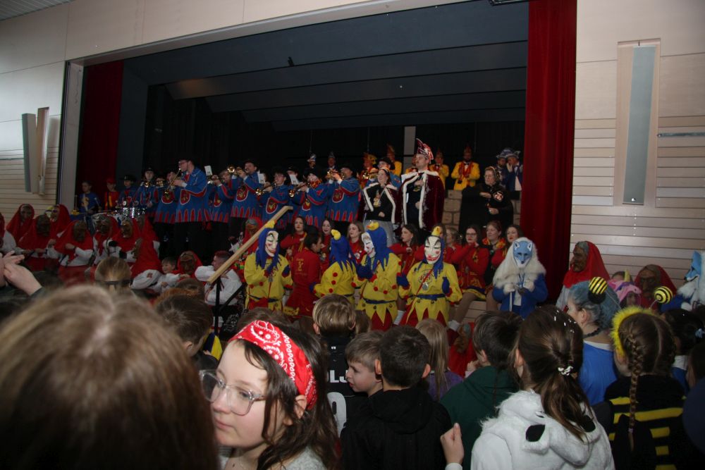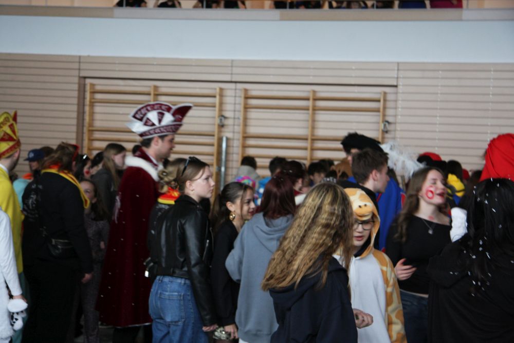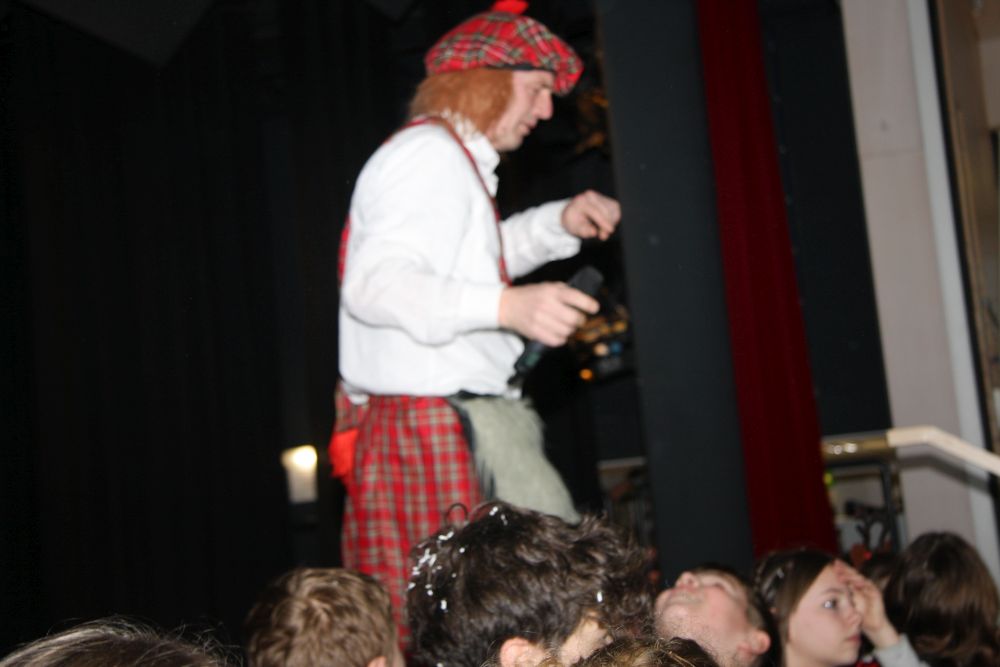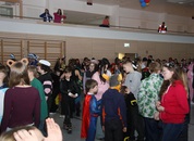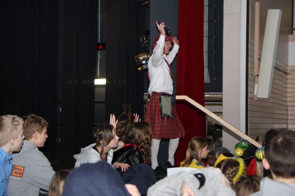 Mit großem Lärm und Dschinderassabumm stürmte die Schar das Schulhaus, durchstreifte sämtliche Stockwerke, Treppenhäuser und Gänge und riss die Schüler aus dem hochkonzentrierten Unterricht. In langem Zug ging es dann hinüber in die Remshalle, wo alles in ein buntes Faschingstreiben mündete, zunächst unter Kommando der Haugga Narra und Holger Franke, und als diese dann weiterzogen, mit unserem wieder genesenen Herrn Schrader, nachdem er im vergangenen Jahr mit lädierter Schulter ausgefallen war, als Stimmungskanone. Die "Zappelkids" und die Kindergarde der Schönbrunnennnarren des TSV Essingen bereichtern das Bühnenprogramm.