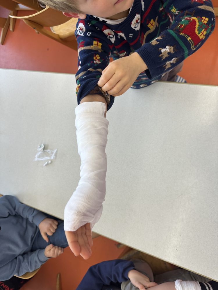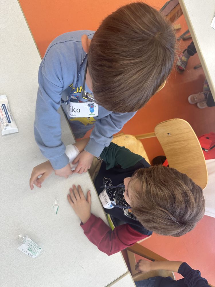 In verschiedenen Stationen konnten die Kinder wichtige Grundlagen der Ersten Hilfe kennenlernen. Sie legten Verbände und Pflaster an, übten die stabile Seitenlage und setzten mit viel Begeisterung Notrufe über Walkie-Talkies