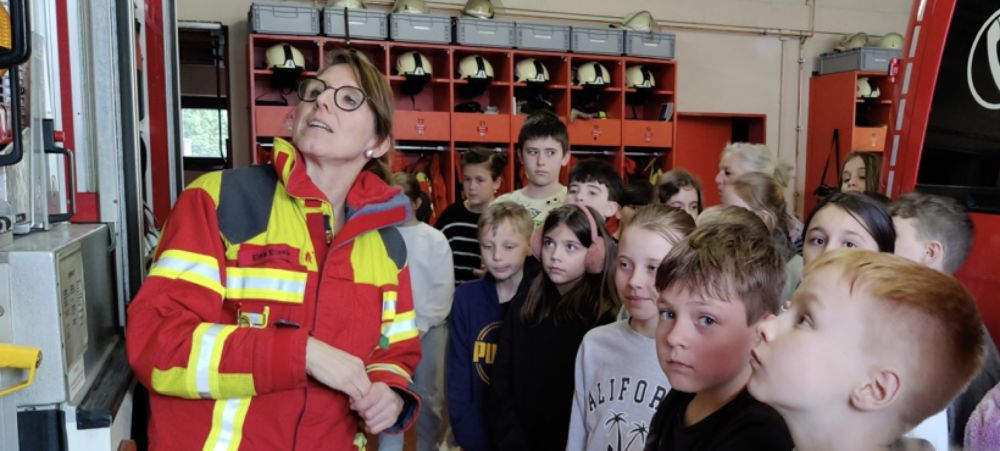 Die Schülerinnen und Schüler durften sich in einen der Einsatzwagen setzen und lernten viel über die Ausrüstung der Feuerwehrleute und deren Einsätze kennen.