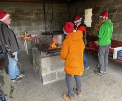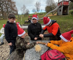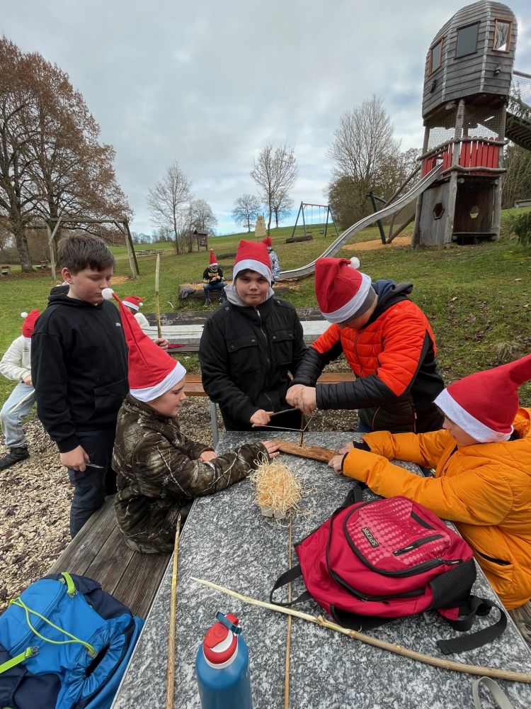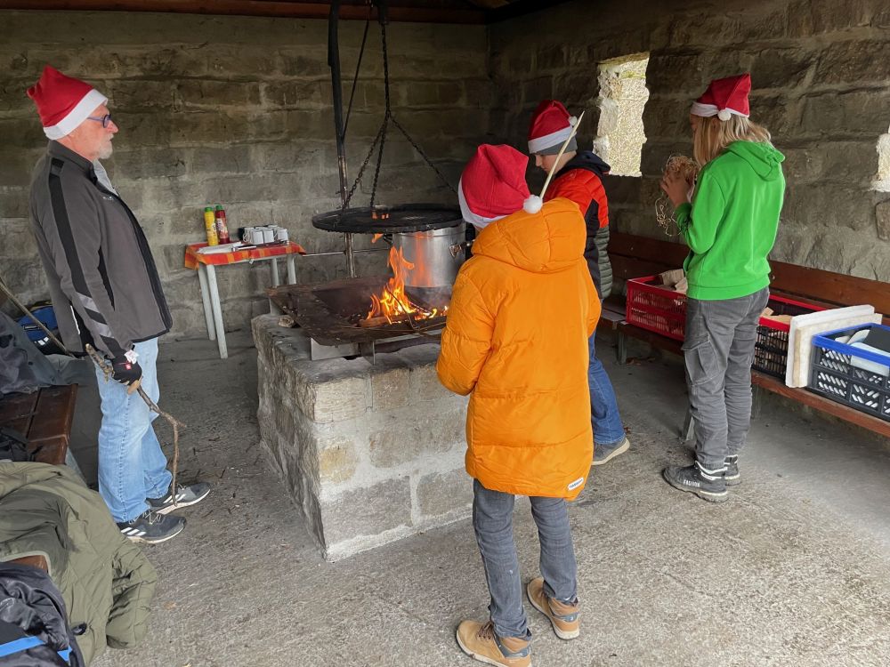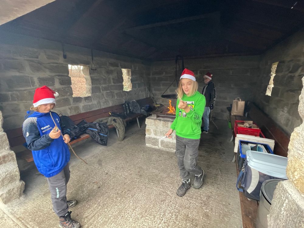 Nach dem kurzen Anstieg hinauf auf’s Essinger Köpfle wartete dort auf die 13 jugendlichen Teilnehmer eine schöne Überraschung. Die Wanderführer Angelika und Jakob Tittl von der Albvereinsortsgruppe Essingen erwarteten die Schülerinnen und Schüler in der dortigen Grillhütte mit einem vorbereiteten Lagerfeuer, Würstchen und heißem Kinderpunsch. Bevor man sich jedoch ans Grillen machen konnte, musste von den Kids erst mit einer steinzeitlichen Feuersäge ein Feuer entfacht und mit den mitgebrachten Taschenmessern die Grillstecken geschnitzt werden. Mit geselligen Spielen, einer spannenden Schatzsuche rund um den tollen Spielplatz und der einen oder anderen dampfenden Tasse Punsch vertrieb man sich die Zeit bis die ersten Würste dann knusprig gegrillt und verzehrbereit waren.