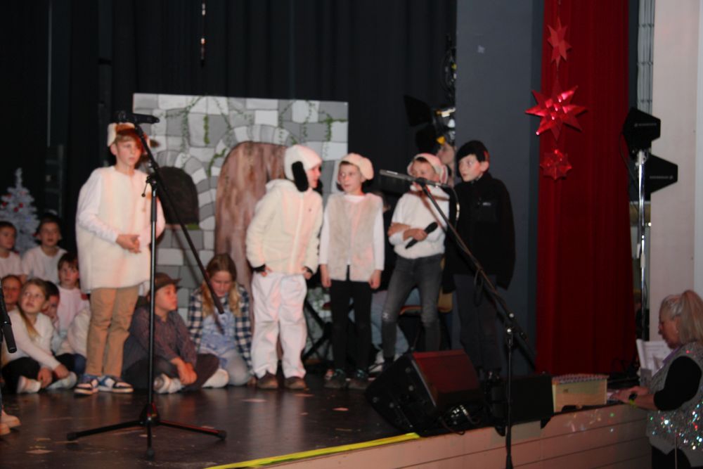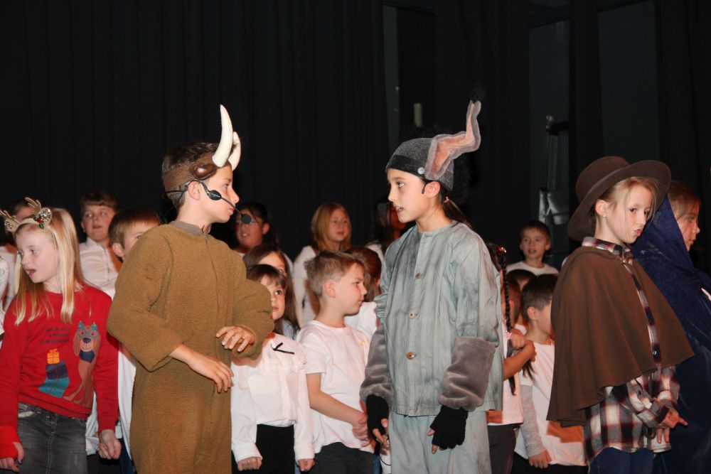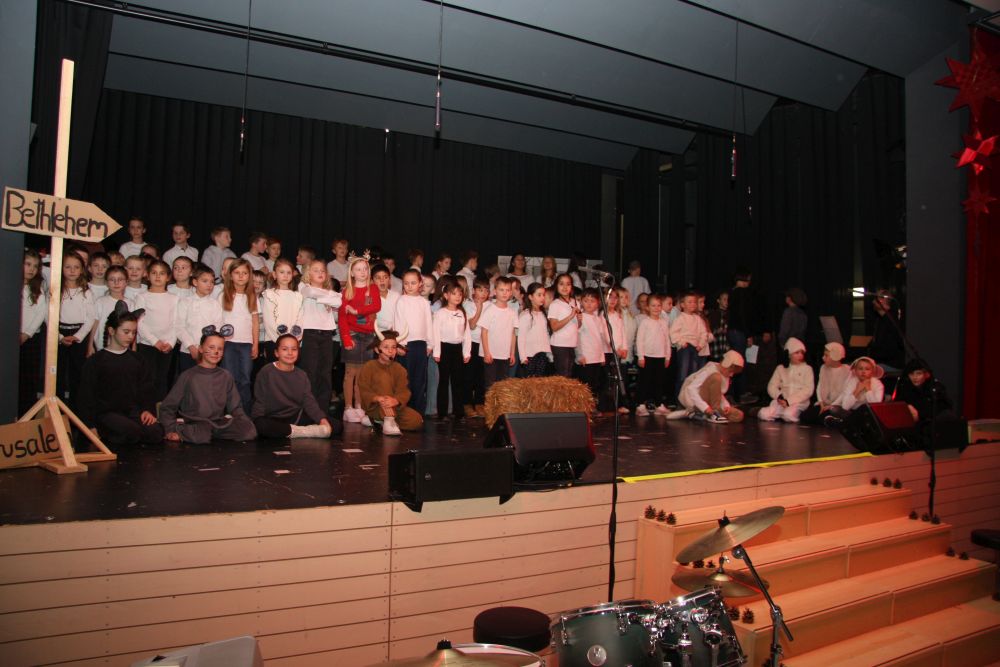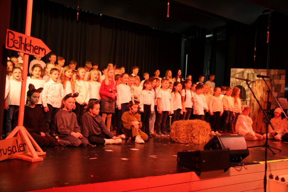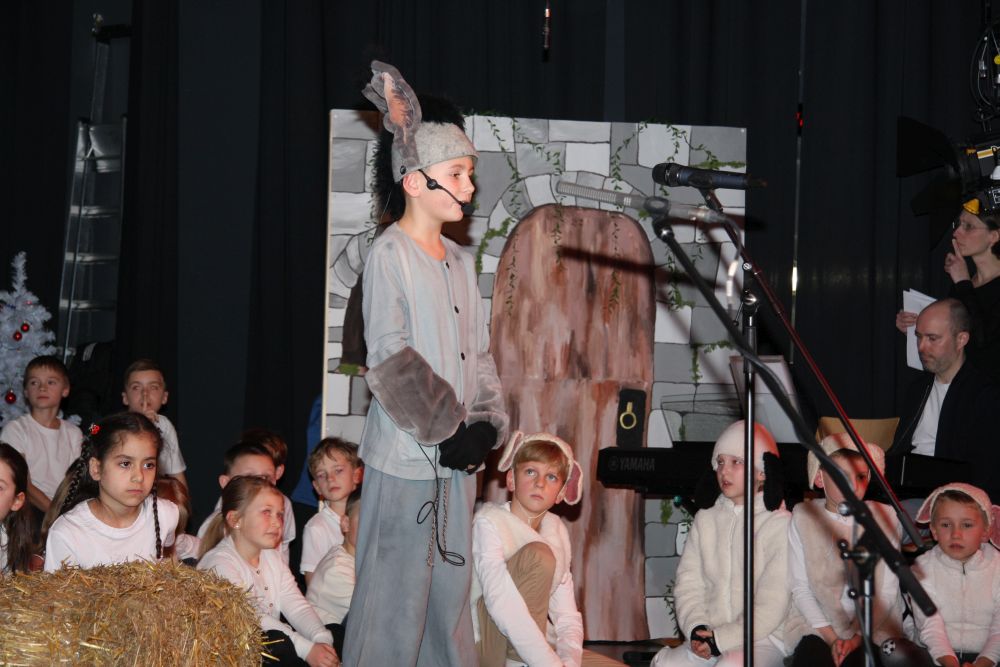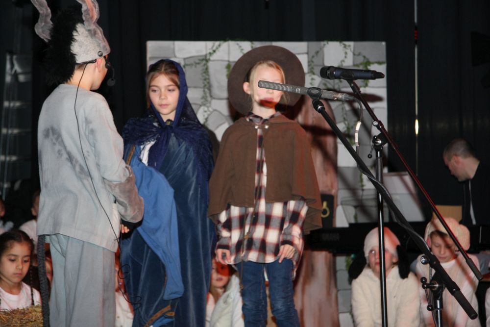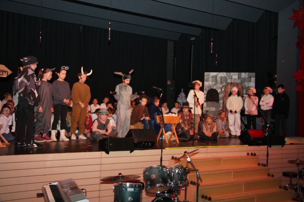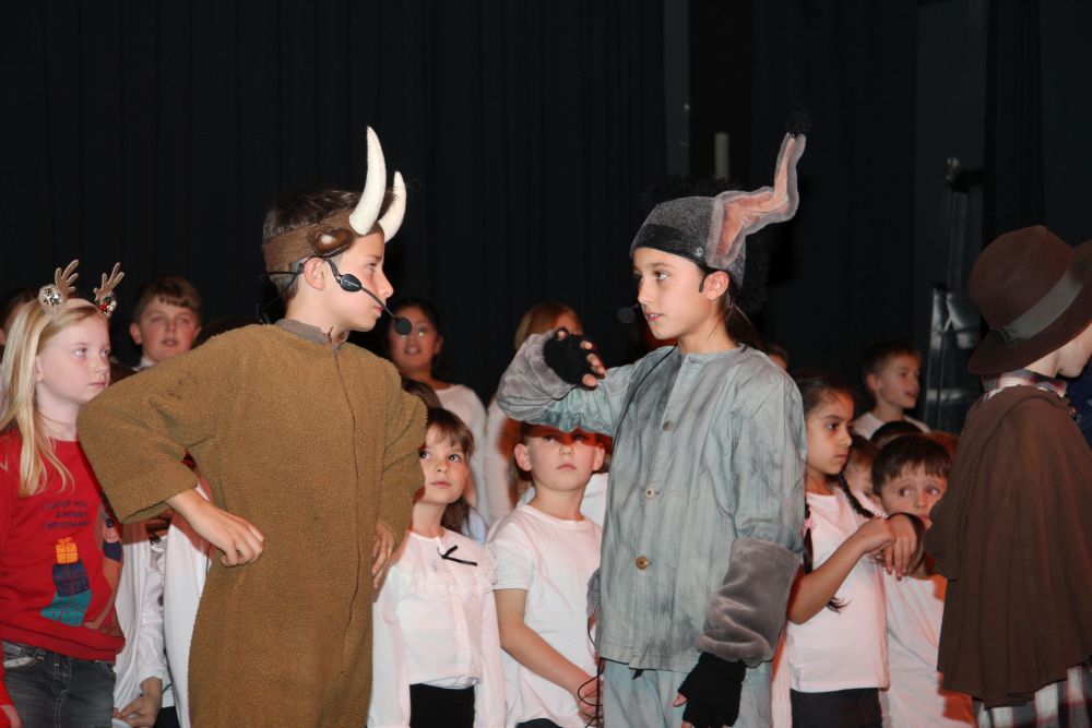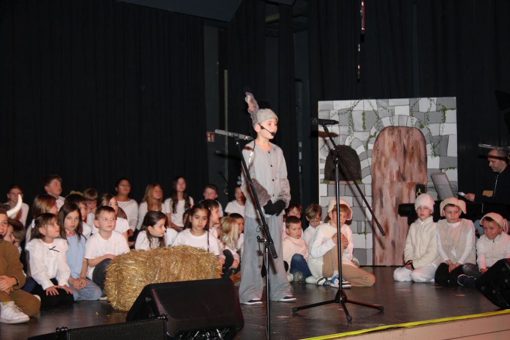 Ausschnitte aus dem Kindermusical „Spezialauftrag für einen Esel“ präsentierten alle ersten und vierten Klassen, intensiv einstudiert von ihren Klassenlehrerinnen Hiller, Göbelt, Adams, Herzog und Paul, sowie Johannes Fischer aus der Sekundarstufe am E-Piano. Das Weihnachtsgeschehen um Jesus, Maria und Josef wird aus der Sicht des Esels Joschi dargestellt.