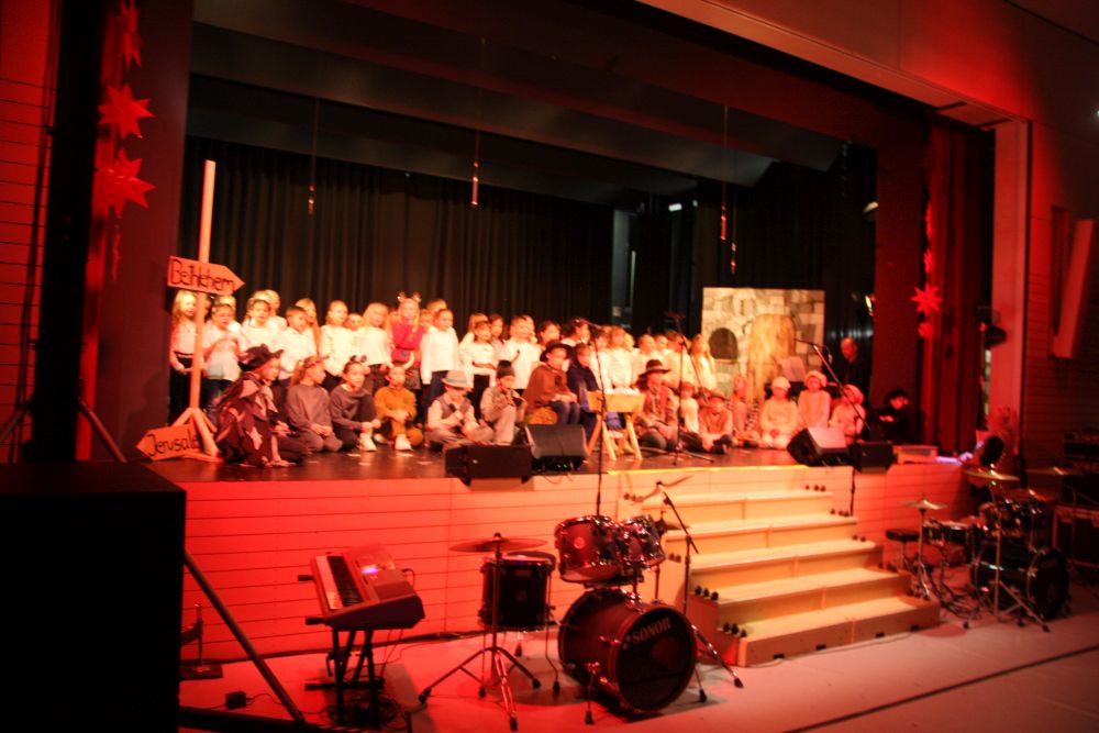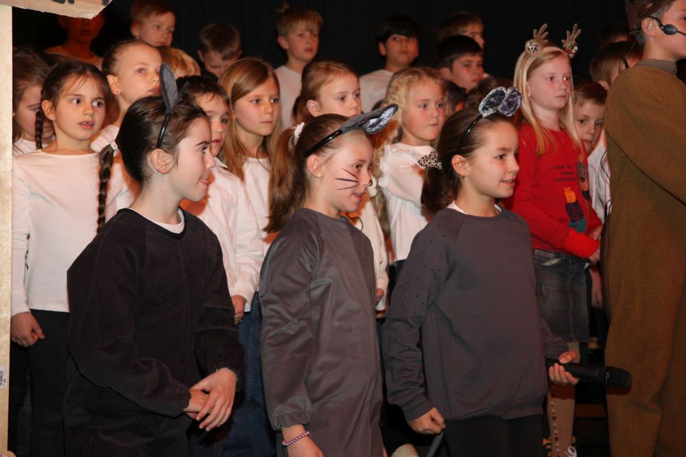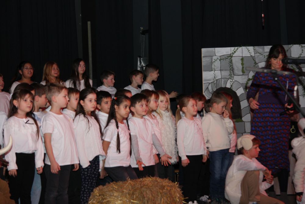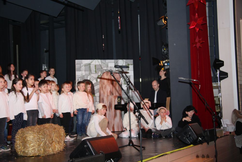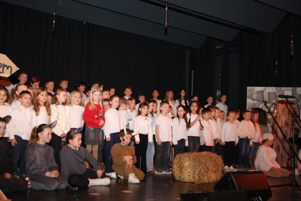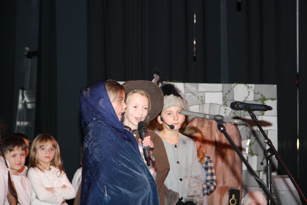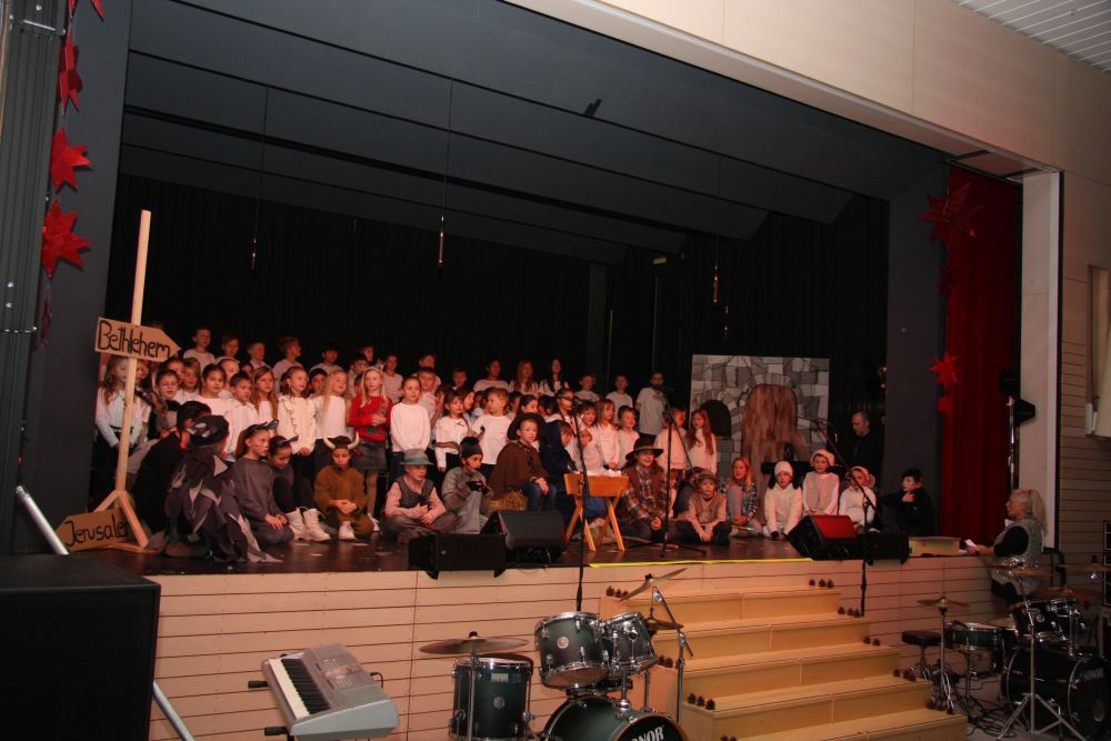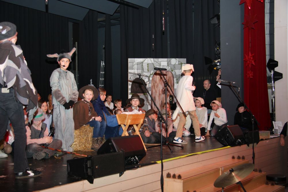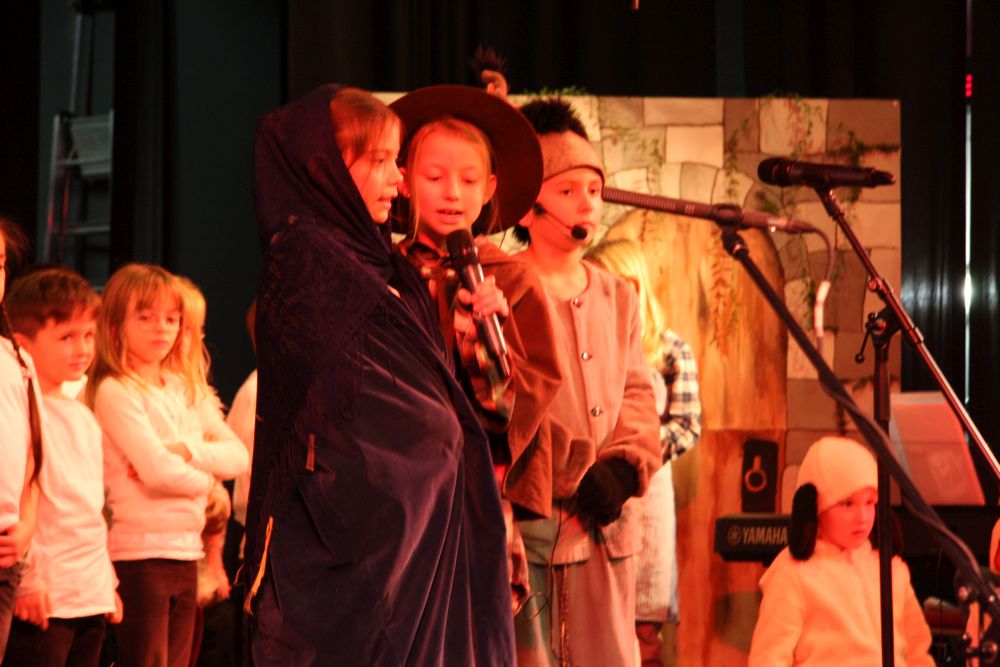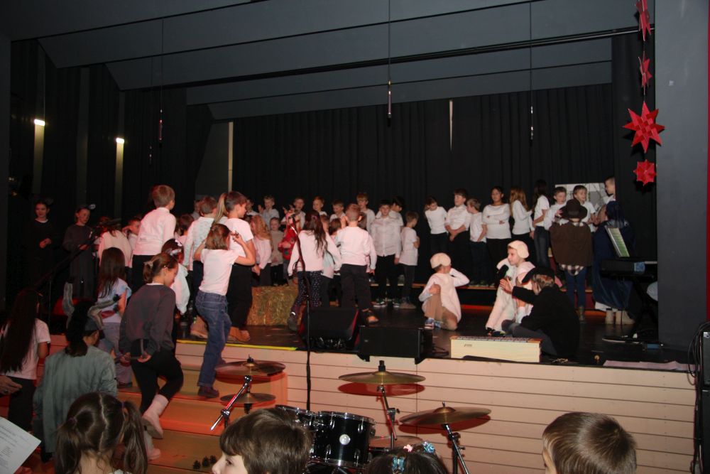 Ausschnitte aus dem Kindermusical „Spezialauftrag für einen Esel“ präsentierten alle ersten und vierten Klassen, intensiv einstudiert von ihren Klassenlehrerinnen Hiller, Göbelt, Adams, Herzog und Paul, sowie Johannes Fischer aus der Sekundarstufe am E-Piano. Das Weihnachtsgeschehen um Jesus, Maria und Josef wird aus der Sicht des Esels Joschi dargestellt.