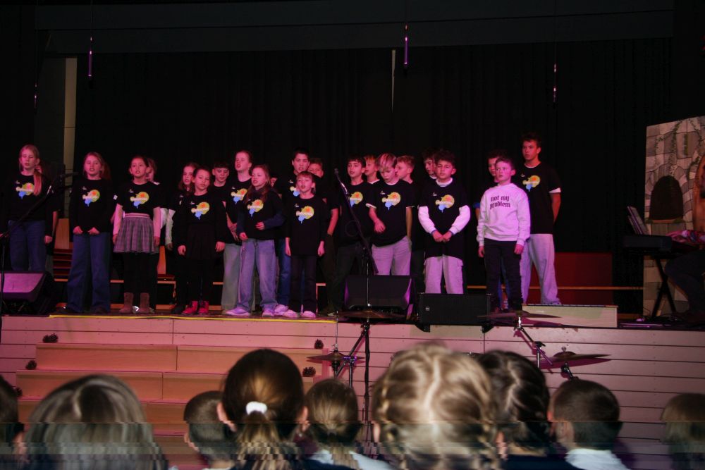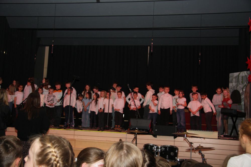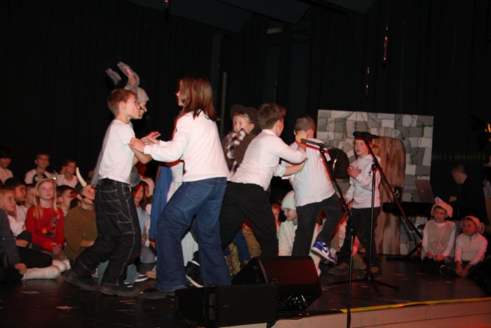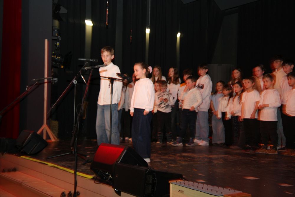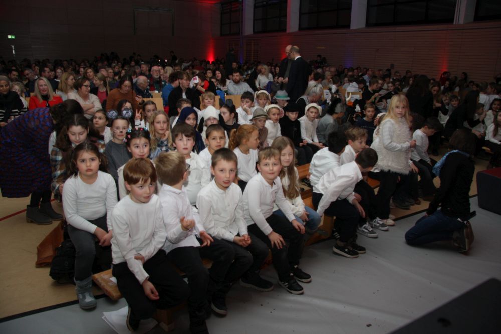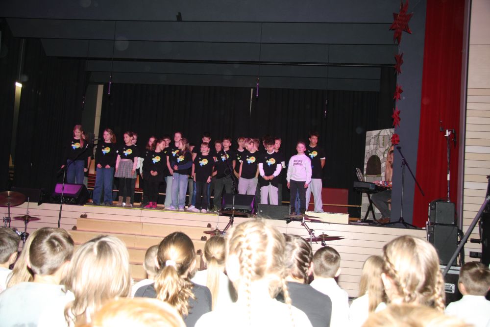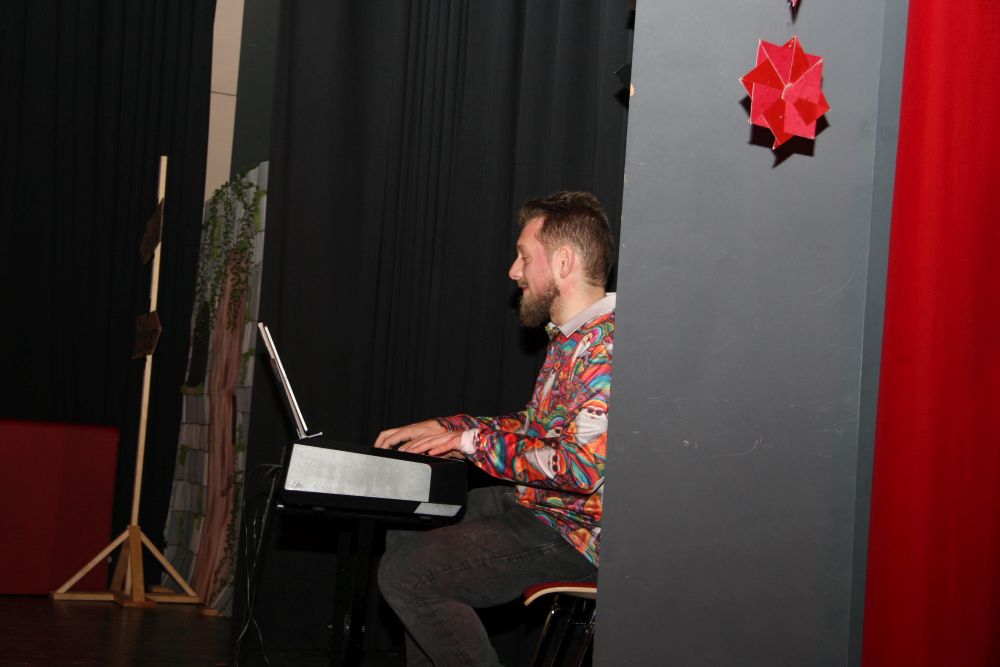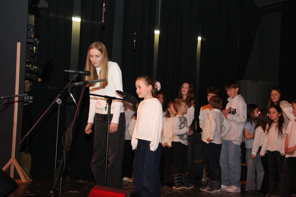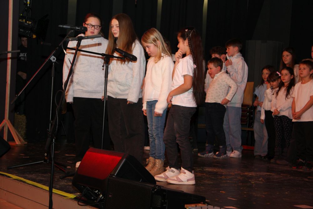 Ausschnitte aus dem Kindermusical „Spezialauftrag für einen Esel“ präsentierten alle ersten und vierten Klassen, intensiv einstudiert von ihren Klassenlehrerinnen Hiller, Göbelt, Adams, Herzog und Paul, sowie Johannes Fischer aus der Sekundarstufe am E-Piano. Das Weihnachtsgeschehen um Jesus, Maria und Josef wird aus der Sicht des Esels Joschi dargestellt.