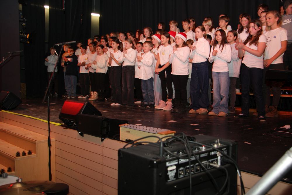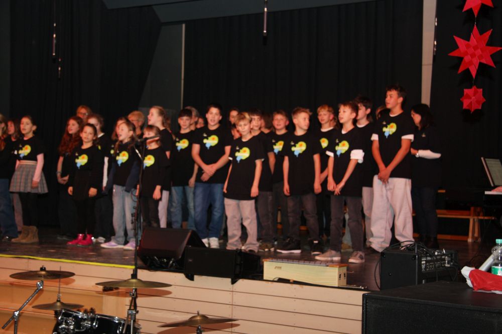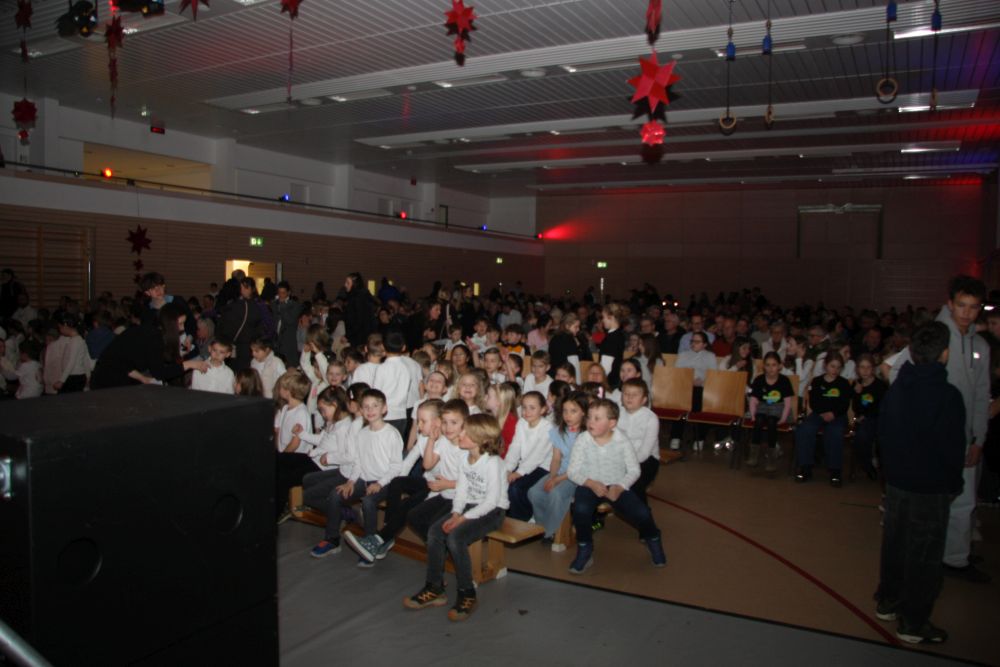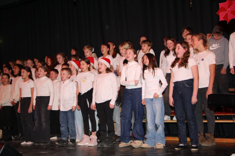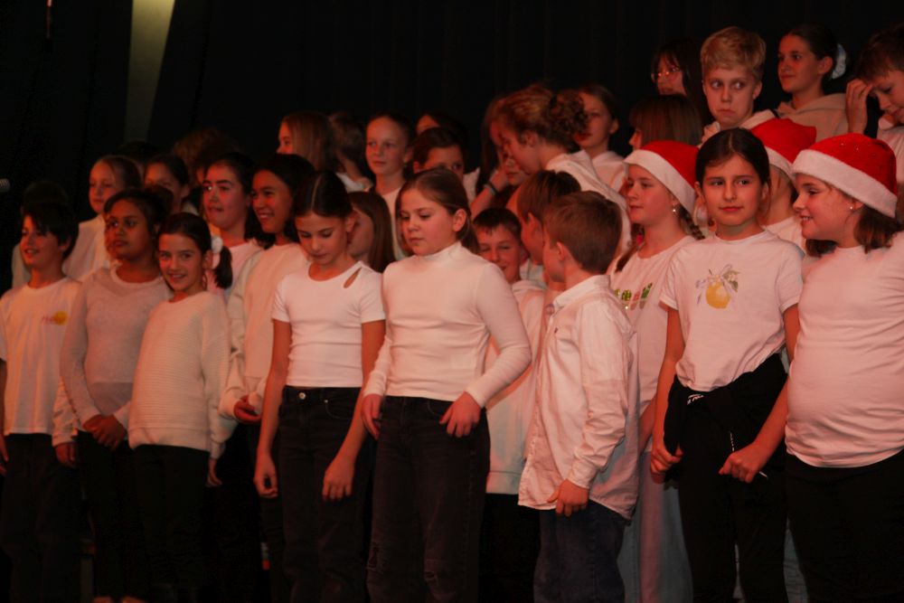 „Merry Christmas Everyone“ wünschten mit deutschem Liedtext die drei 5. Klassen ihren Zuhörern. Katharina Habrom und Marietta Fischer hatten das Lied mit den Kindern eingeübt.
