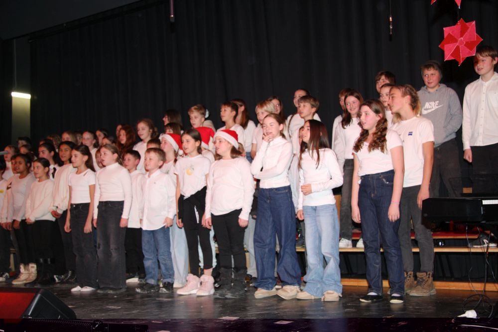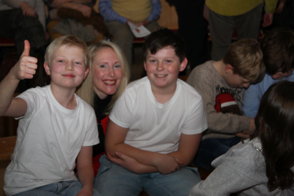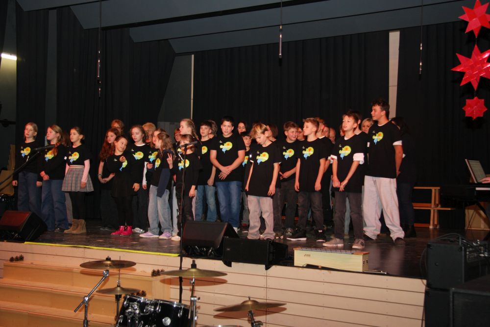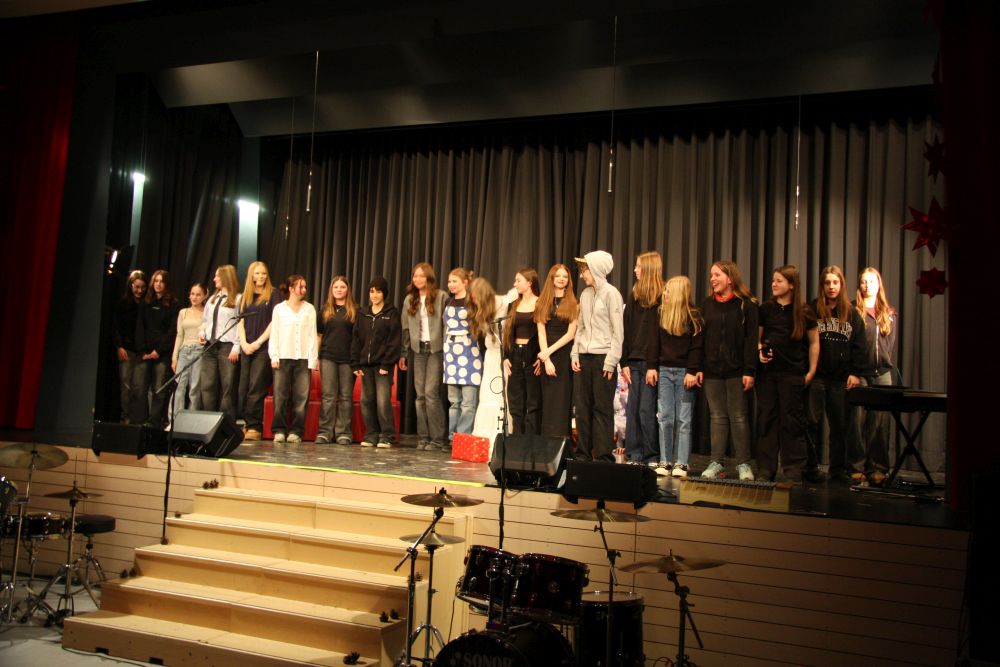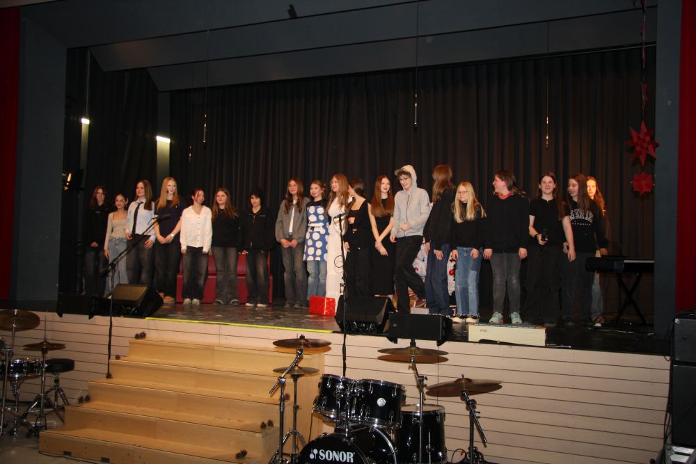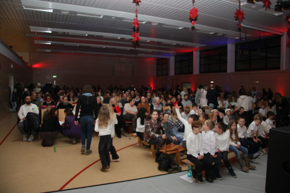 „Merry Christmas Everyone“ wünschten mit deutschem Liedtext die drei 5. Klassen ihren Zuhörern. Katharina Habrom und Marietta Fischer hatten das Lied mit den Kindern eingeübt.