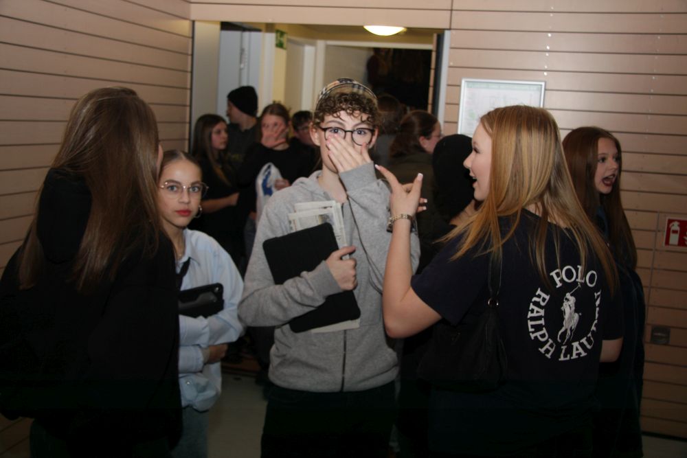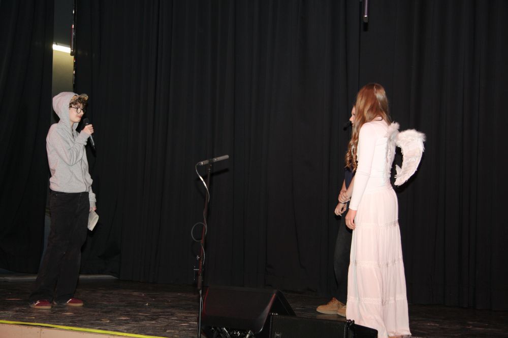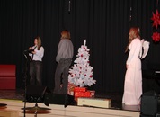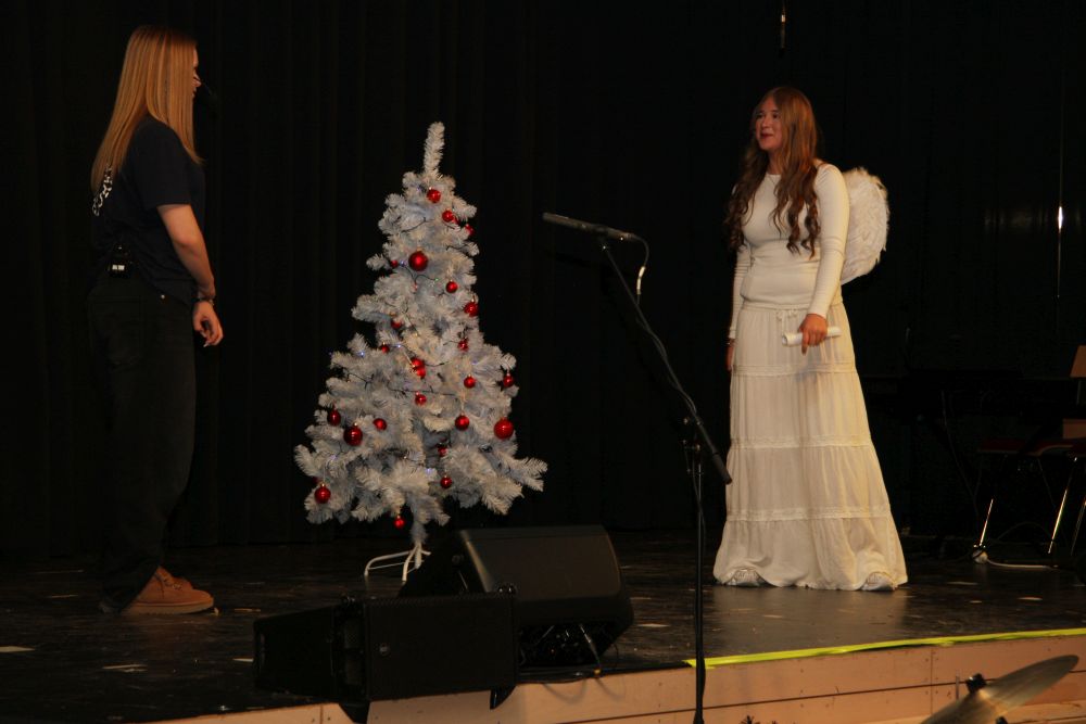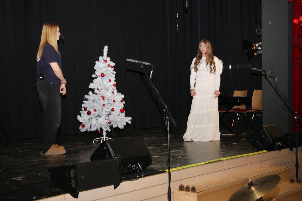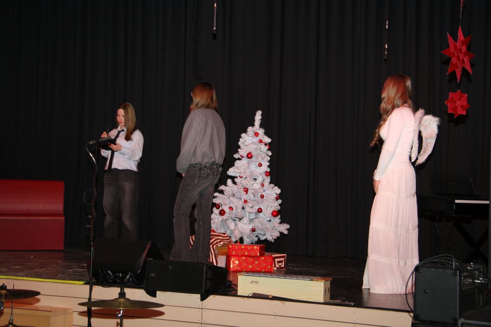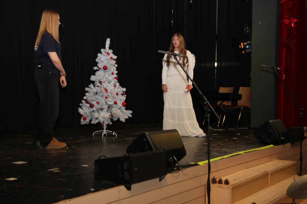 Ein Höhepunkt jeder Weihnachtsfeier ist der Auftritt der Theater AG. Das eher nachdenkliche „Ein Engel auf Erden“ – Theaterstück zeigt die übergroße Erwartung an die Geschenke auf und stellt dem die eigentliche Weihnachtgeschichte in ihrer Schlichtheit entgegen. Mit großer Empathie spielten die Siebt- bis Zehntklässler unter Regie von Steffen Dilek.