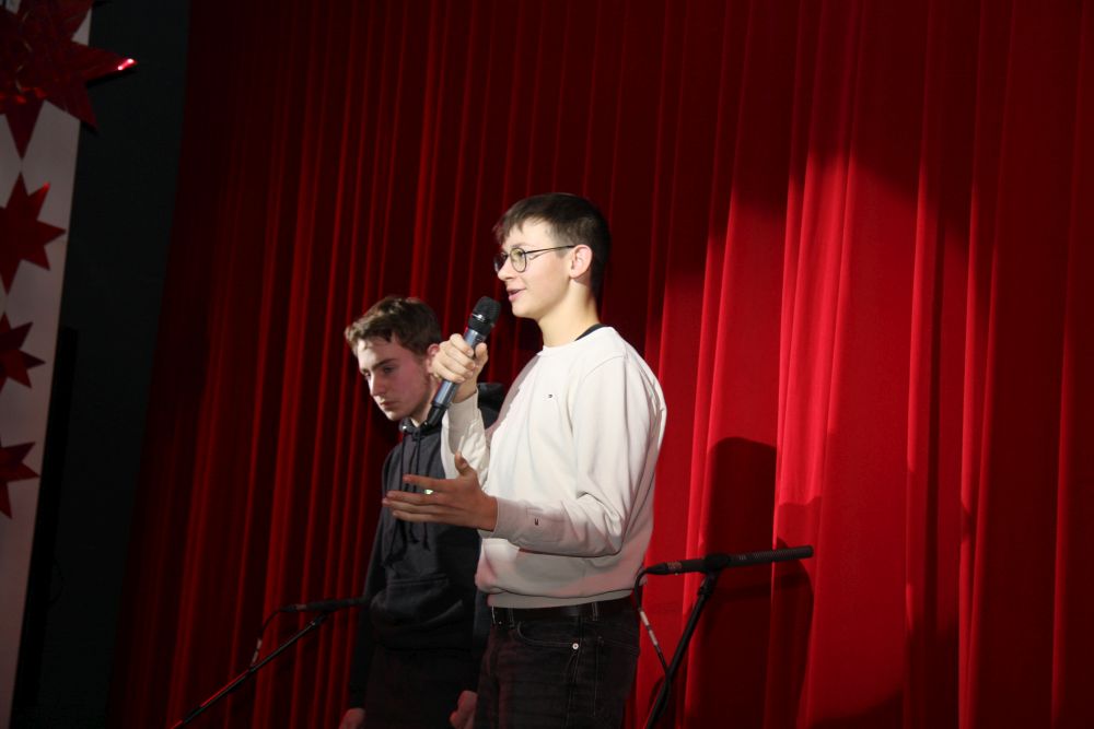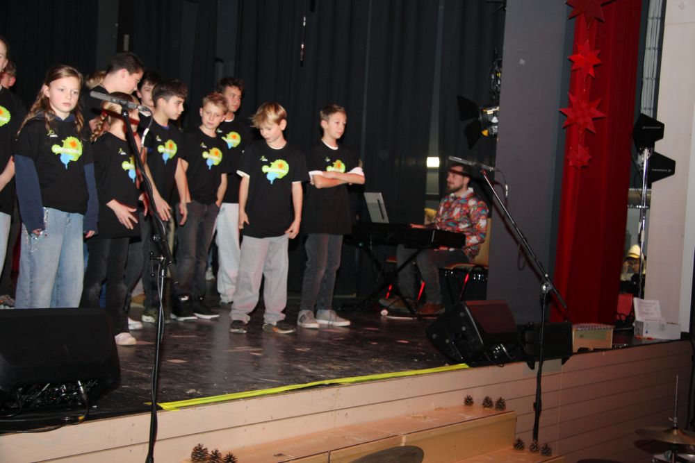 Kooperation des Liederkranz Essingen mit der Parkschule und präsentierte vier schwungvolle Songs, von Wortakrobatik wie bei Rap oder HipHop bis hin zum Weihnachtsklassiker Winter-Wonderland, bei dem der Chor noch stimmliche Verstärkung durch Sängerinnen des Liederkranzes erhielten. Simon Popp, Lehrer der Parkschule und zugleich Chorleiter beim Liederkranz, leitete vom Piano her souverän. Mit diesen Songs eröffnete der Chor auch die wenig später anberaumte Feier der Sekundarstufe.