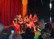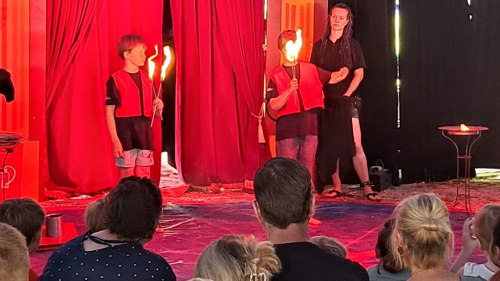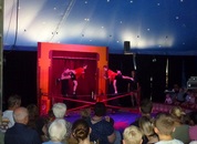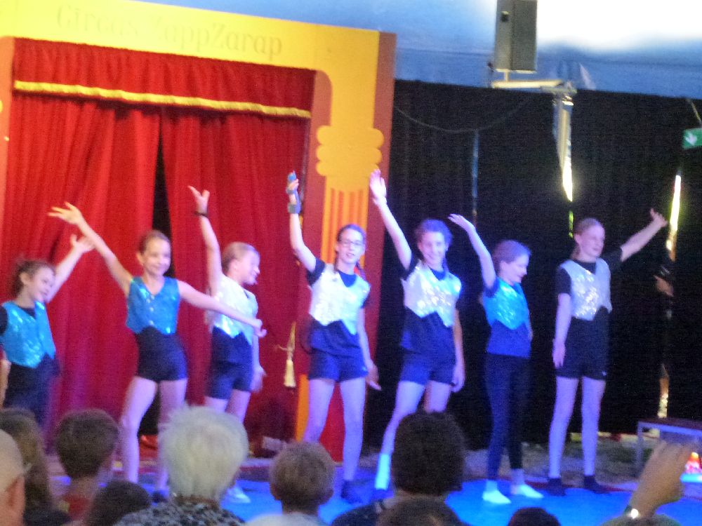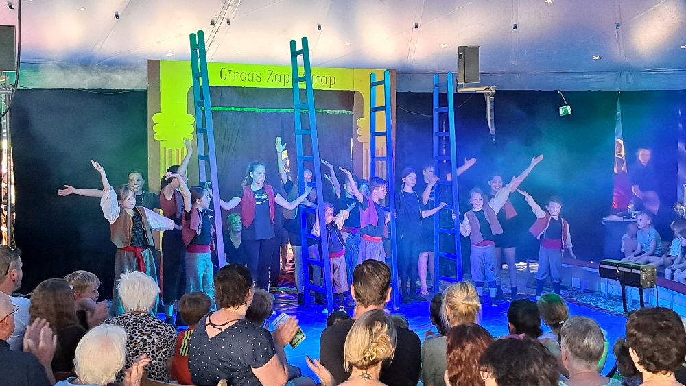 Am Freitag und Samstag wurde das Gelernte in vier großen, bis auf den letzten Platz ausverkauften Shows präsentiert. Die jungen Artisten und Akrobaten lösten große Begeisterung aus, wurden laut klatschend bejubelt und in ihren Darbietungen unterstützt. Jeder hatte seinen Einsatz, seine Aufgabe, und mit großem Geschick und Eifer, den sich manches Kind nicht zugetraut hätte, holte es das Beste aus sich heraus. Es gab die Leiterakrobaten, die Zauberer und Clowns, Feuerkünstler und Fakire auf Nagelbrett und Scherbenhaufen, Jongleure und Akrobaten mit dem Diabolo, Nachtlichttänzer und Hula-Hoop-Reifen-Künstler. Dass das alles in einem richtigen Zirkuszelt und in einer richtigen Manege, untermalt mit passender Zirkusmusik aufgeführt werden konnte, dafür sorgten Josie und Philipp vom Zirkus ZappZarap.